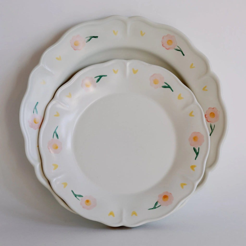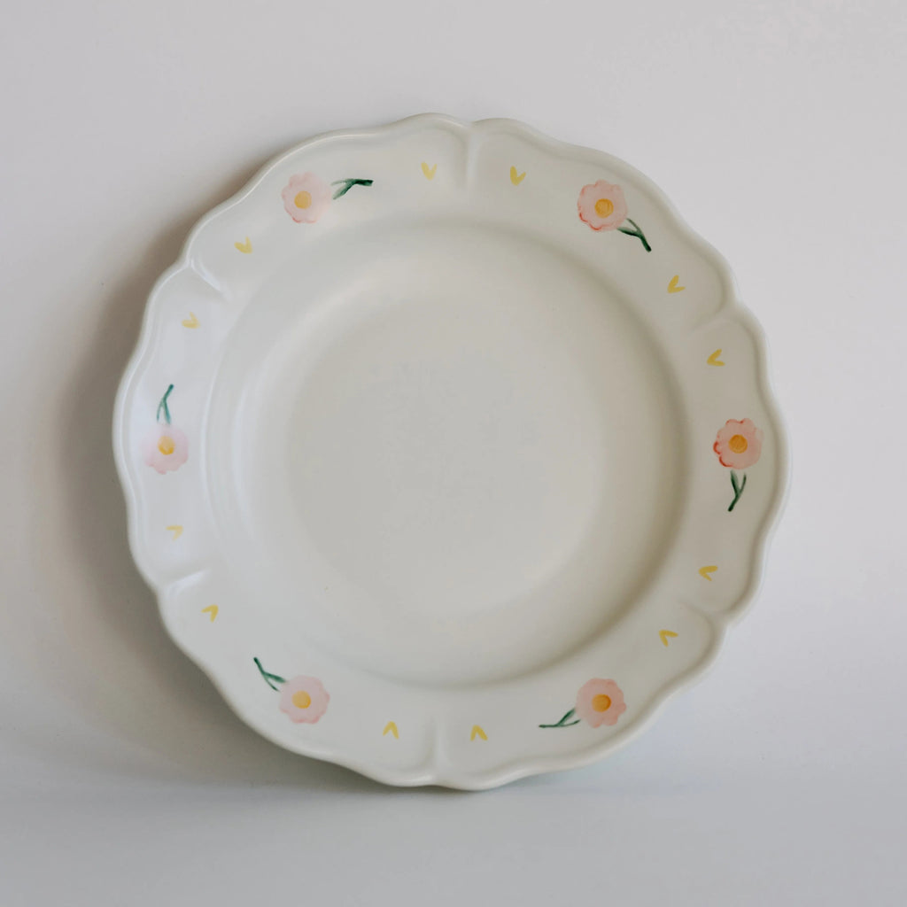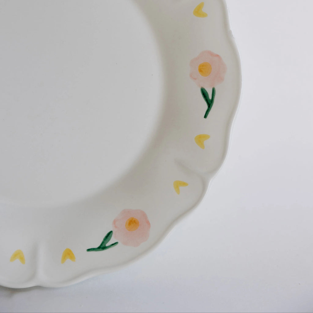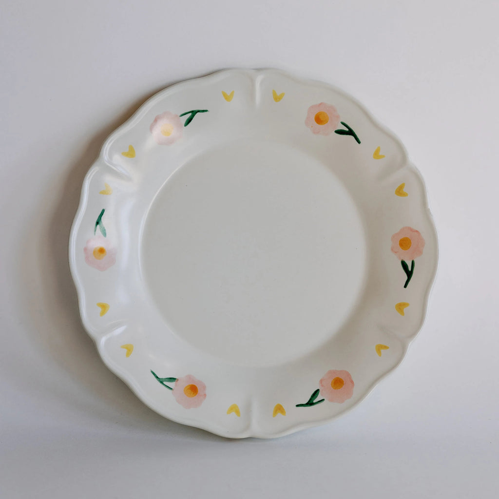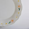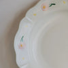Delicate peach and yellow blooms dance along a scalloped edge, creating a playful border on pure white ceramic. This accent plate combines classic French countryside charm with modern simplicity.