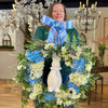 A professional-grade spring wreath featuring a harmonious blend of cool blues and crisp whites, centered around a soft, flocked bunny silhouette. This piece is designed for high-impact curb appeal or as a focal point for indoor spring decor.