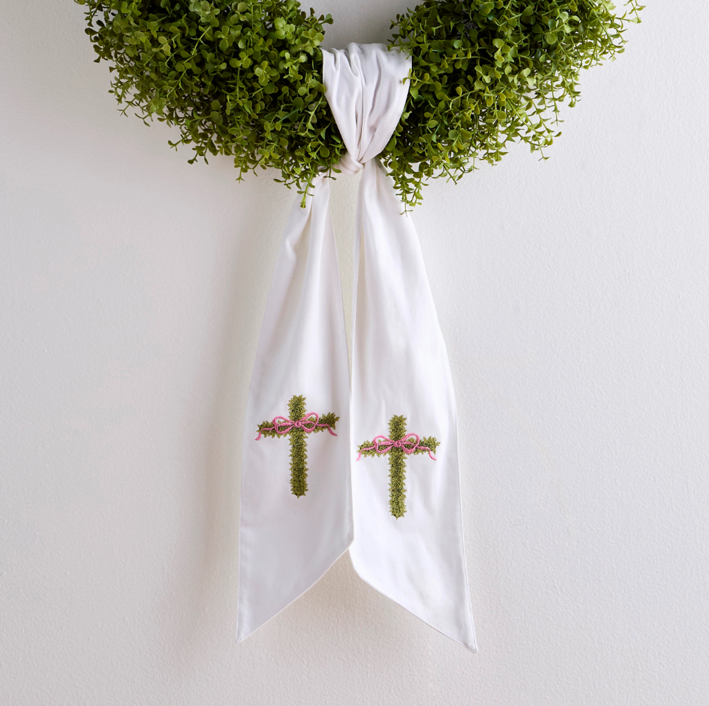 Dress up a spring wreath with a soft, meaningful touch using the 60" Cross Wreath Sash. Made from crisp white cotton and finished with embroidered green crosses tied with a sweet pink bow, this sash brings a faith-forward detail to Easter décor and everyday entry styling. The long, tailored shape drapes beautifully from grapevine wreaths, boxwood rings, or greenery garlands—instantly creating a clean, elevated look.