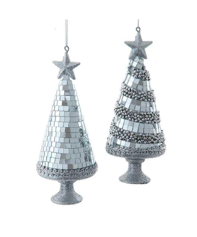 Add shimmer and sophistication to your holiday décor with the Silver Mirror Christmas Tree Ornament. Standing 5.9" tall, each ornament is covered in reflective silver mirror tiles that catch and scatter light beautifully. Finished with a glittered star topper and pedestal-style base, these ornaments bring a chic, modern twist to classic holiday decorating. Available in two styles—each sold separately—so you can mix, match, or collect both.