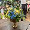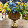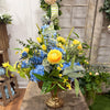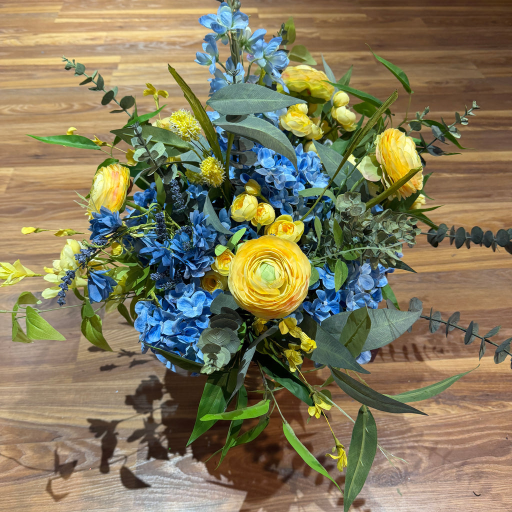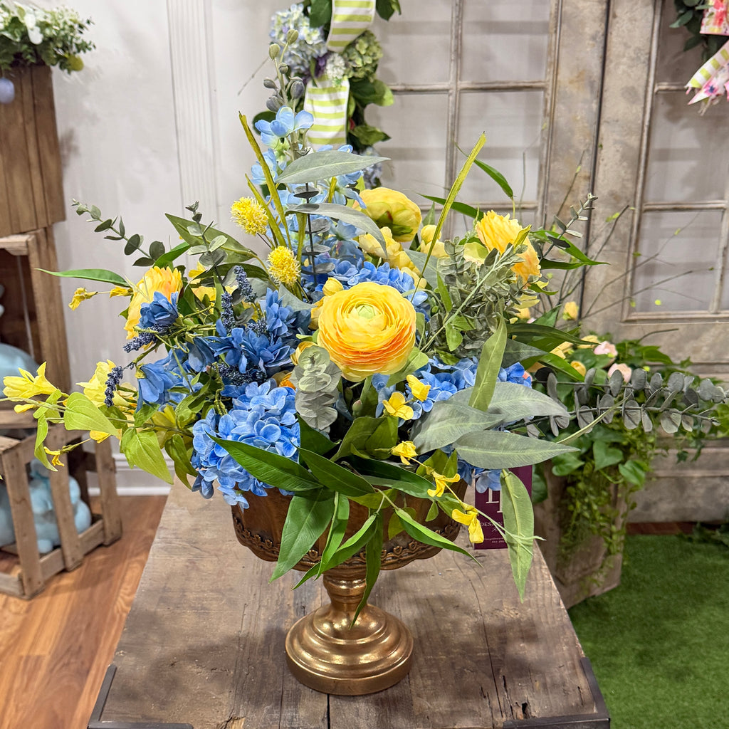 Tranquility and beauty intertwine in our Signature Garden Rhapsody Arrangement. Gently arranged in a beautiful gold compote with real touch blue hydrangeas, butter yellow ranunculus and wildflowers, and the fresh green of eucalyptus, this table arrangement blooms with the essence of spring. Bring a touch of nature into your home with our exquisite design.