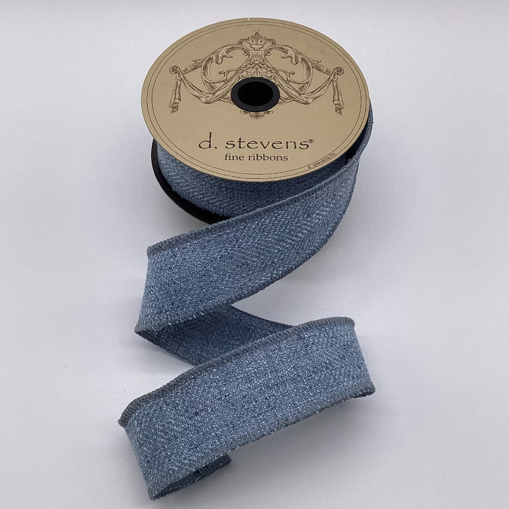 • Faux linen texture for natural elegance • Subtle herringbone weave for tailored detail • Sophisticated cadet blue hue • Wired edges for easy shaping and full bows • 10-yard roll for multiple decorating projects