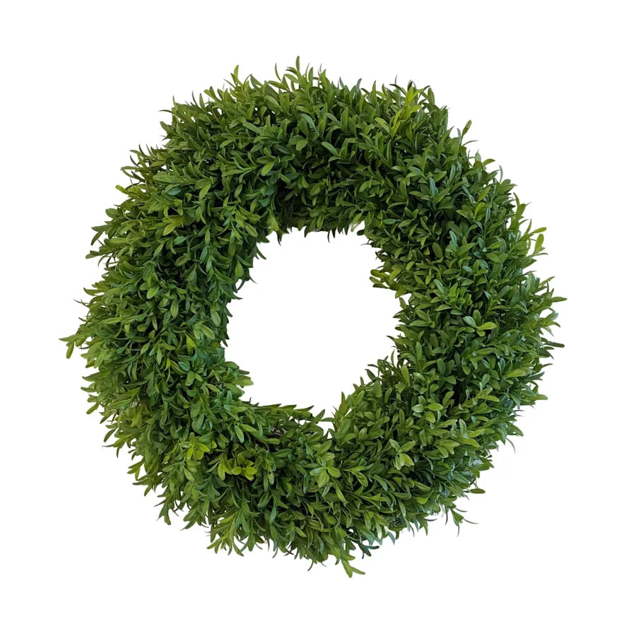 Welcome timeless greenery into your home with our 18" Green Tea Leaf Boxwood Wreath. Crafted with dense, lifelike tea leaf boxwood in rich, vibrant green tones, this classic wreath offers year-round elegance with a fresh, natural look. Its compact, tailored shape makes it perfect for doors, mantels, mirrors, or layering into seasonal displays. Whether left as-is for a clean, refined statement or dressed up with ribbons and accents, this versatile piece brings effortless charm and designer polish to any space.