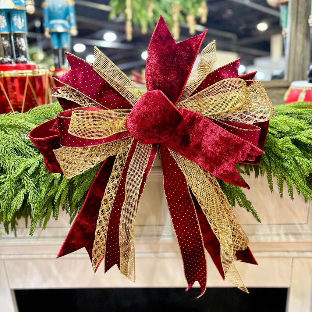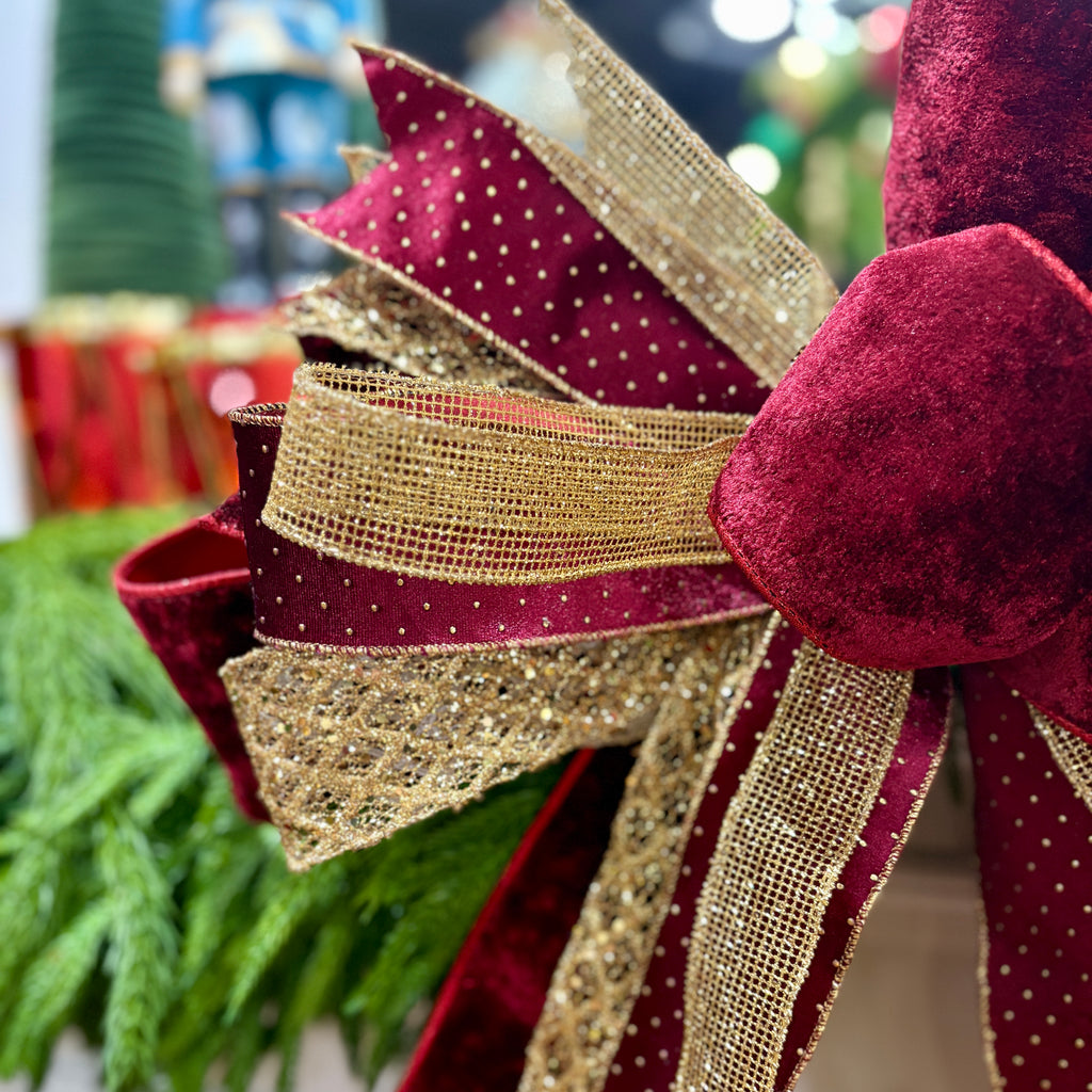 Make a bold and elegant holiday statement with the “Garnet Glamour” Designer Christmas Bow, a stunning 20" handcrafted accent in deep garnet velvet, sparkling gold mesh, and glimmering ribbon detail. This show-stopping bow pairs timeless luxury with high-impact design—perfect for elevating your Christmas wreath, mantel décor, or holiday staircase.