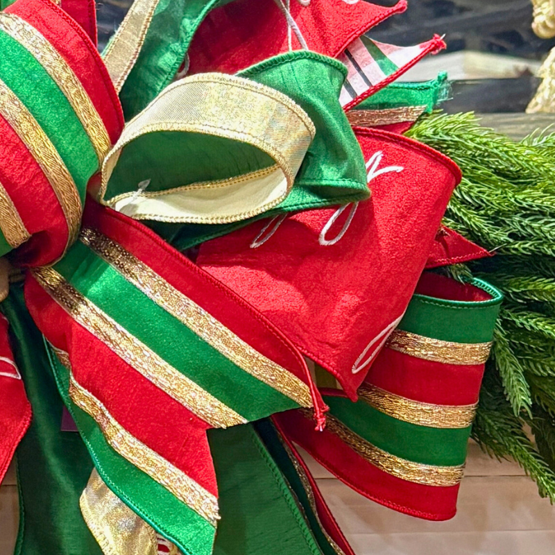 Bring instant joy to your holiday décor with our Handmade Holiday Cheer Bow, a grand 20” wide by 30in long statement piece bursting with classic Christmas charm. Richly layered in festive hues of red, green, and gold—with playful stripes, shimmering gold trim, and whimsical “joy” and “ho ho ho!” script—this designer bow is full of personality and perfectly tailored elegance.