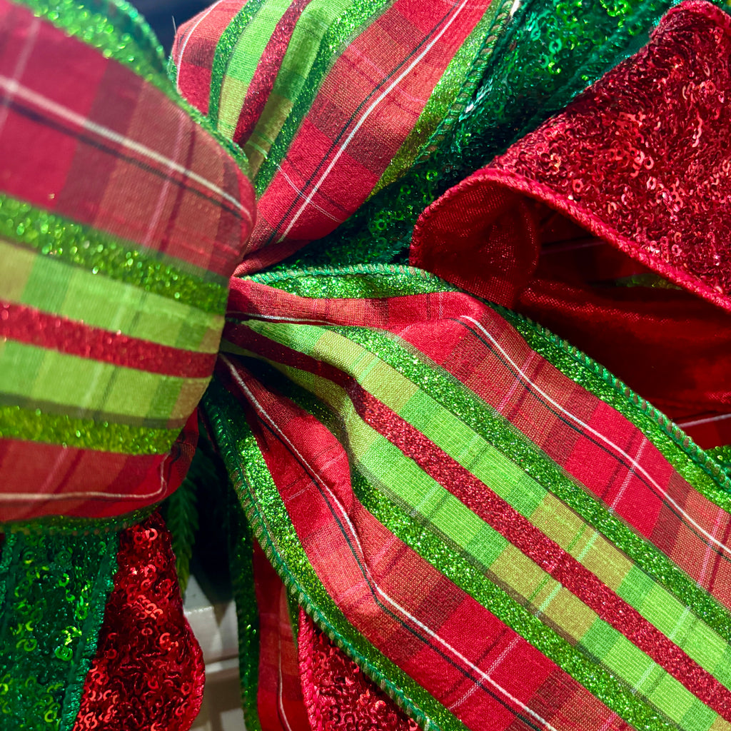 Bring festive cheer to your holiday décor with the Holly Jolly Sparkle bow. Handtied with layers of vibrant red, glittering green, and shimmering accents, this joyful design captures the magic of the season in one radiant statement piece. Perfect for wreaths, garlands, or Christmas tree toppers, it adds instant sparkle and charm wherever it’s displayed.