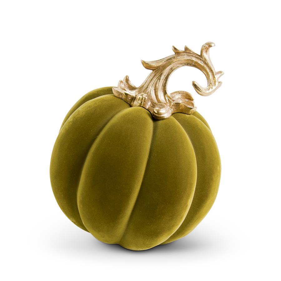 Add a luxurious touch to your fall decor with this 12" Green Velvet Pumpkin. Featuring a soft velvet finish in a rich green hue and an ornate gold filigree stem, this statement piece blends elegance and seasonal charm. Perfect for mantels, tablescapes, or entryway accents.