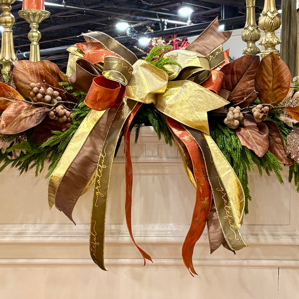 Lush and layered with designer ribbons in rich tones of burnished gold, warm bronze, deep olive, and harvest orange, this bow is finished with a ribbon that’s delicately embroidered with the word “grateful.” Velvet-like textures and subtle metallic sheens catch the light just enough to add understated elegance to any space.