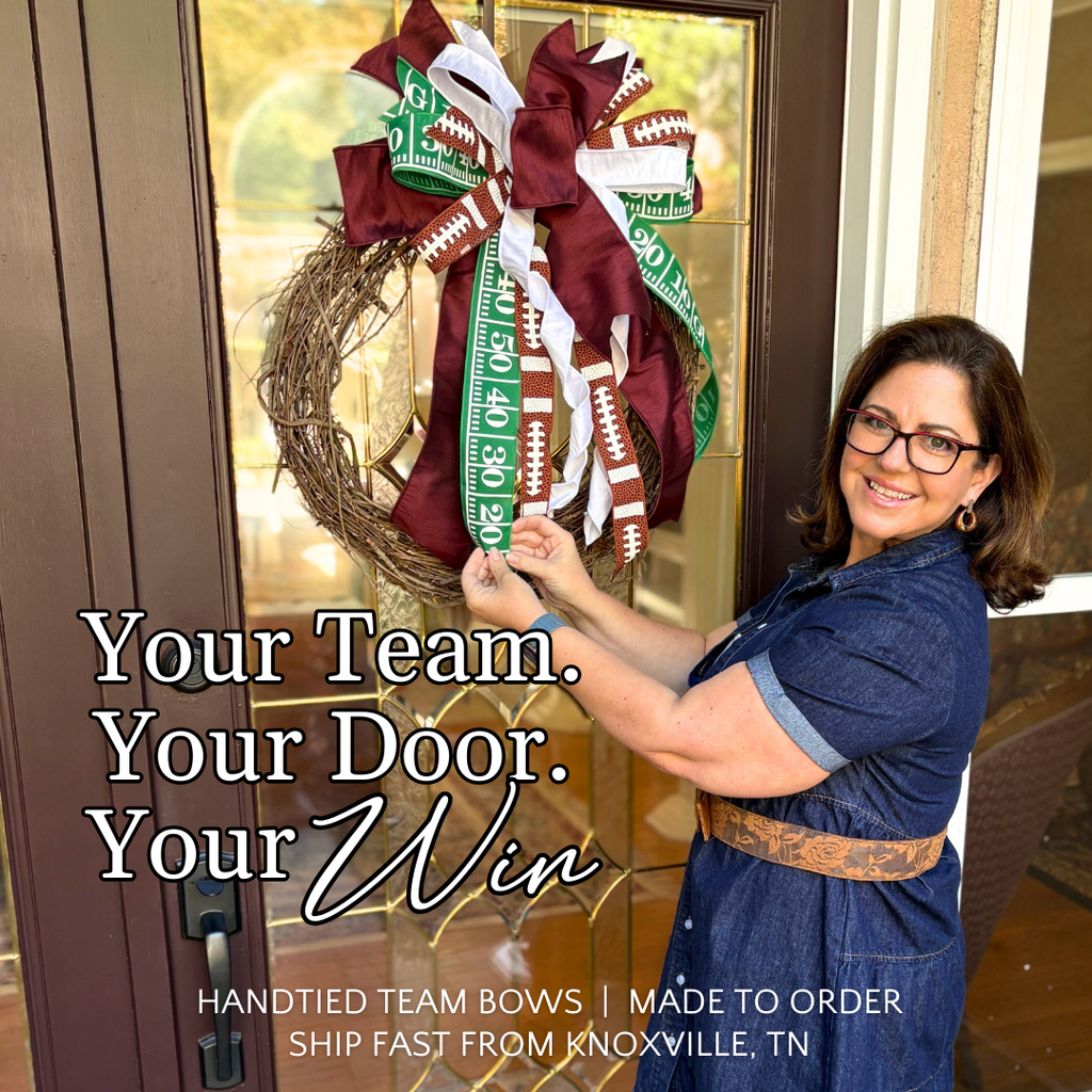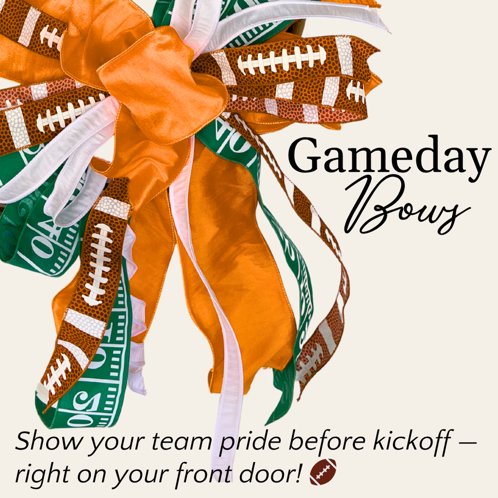 Celebrate football season with a custom-made gameday bow, handcrafted in your team colors. Perfect for wreaths, doors, tailgates, and party decor.