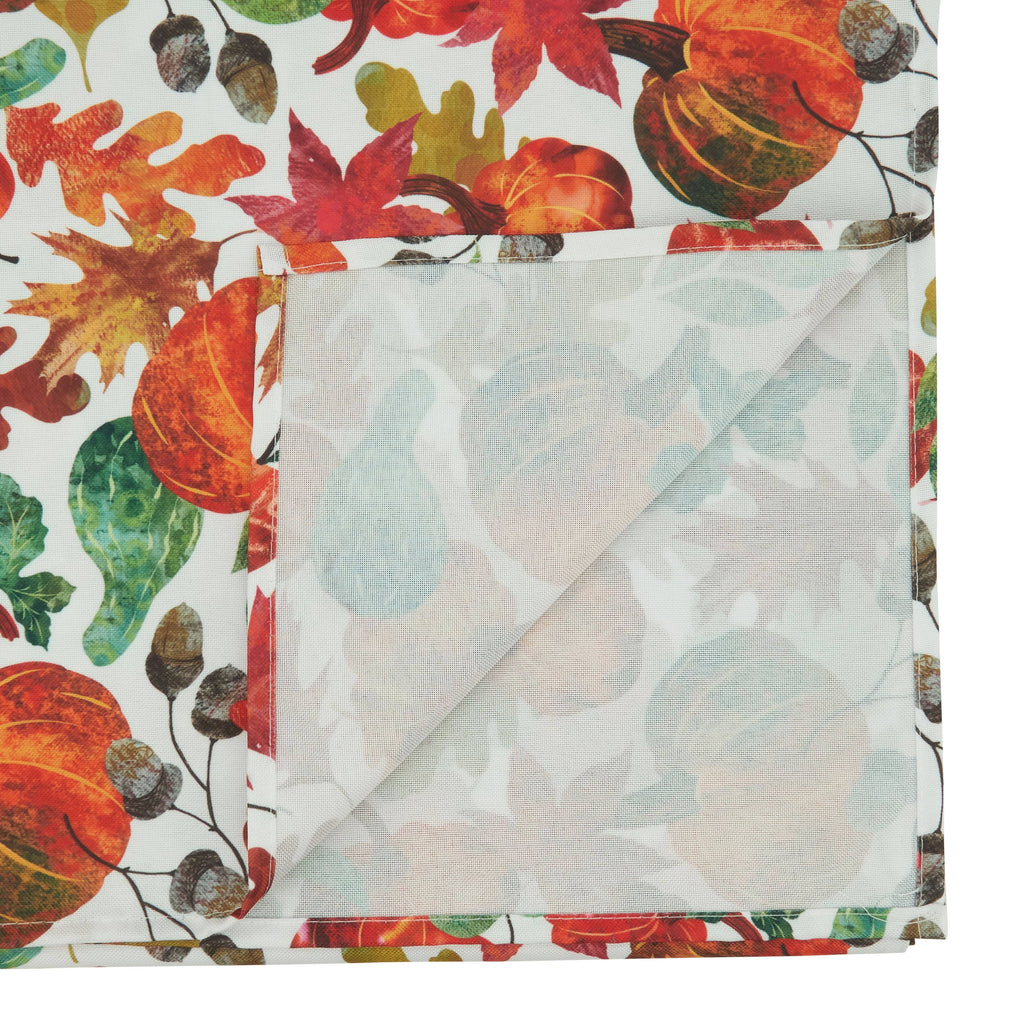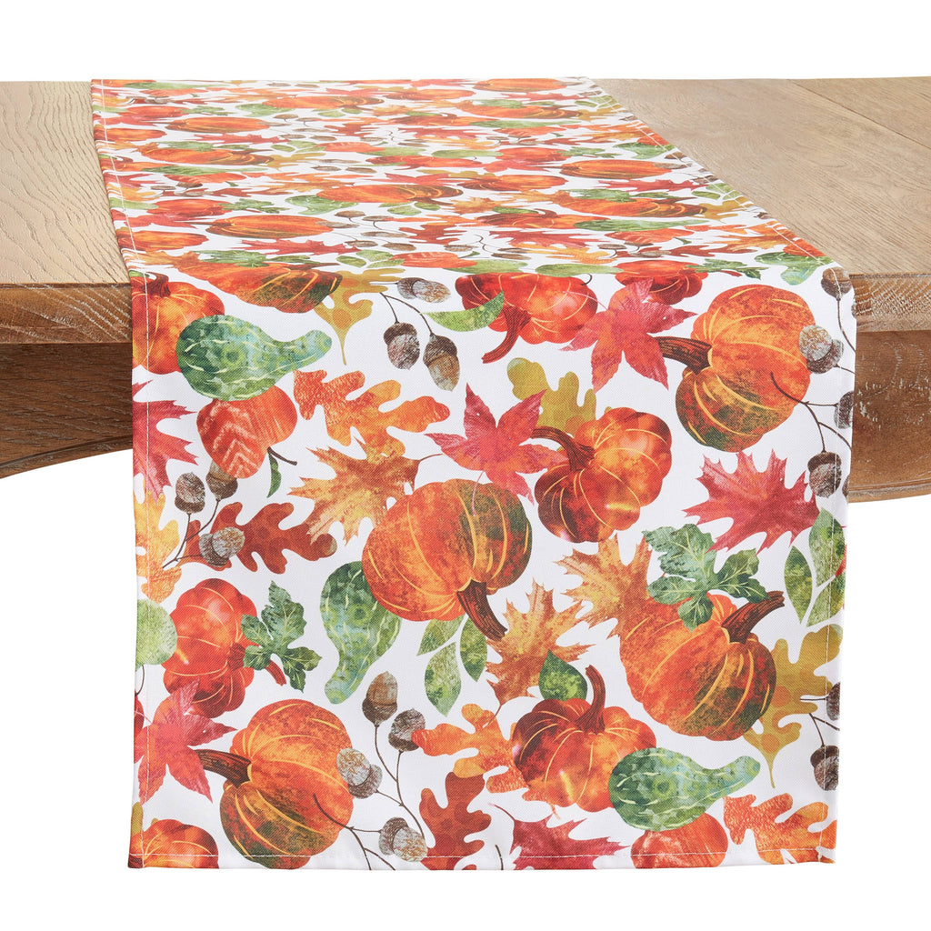 Celebrate the rich beauty of autumn with the Pumpkin Foliage Table Runner. Featuring vibrant pumpkins, leaves, acorns, and fall foliage in warm shades of orange, red, green, and gold on a crisp white background, this runner instantly brings seasonal charm to your table. The detailed design pairs effortlessly with your fall centerpieces, place settings, and gatherings, from casual meals to festive holiday dinners.