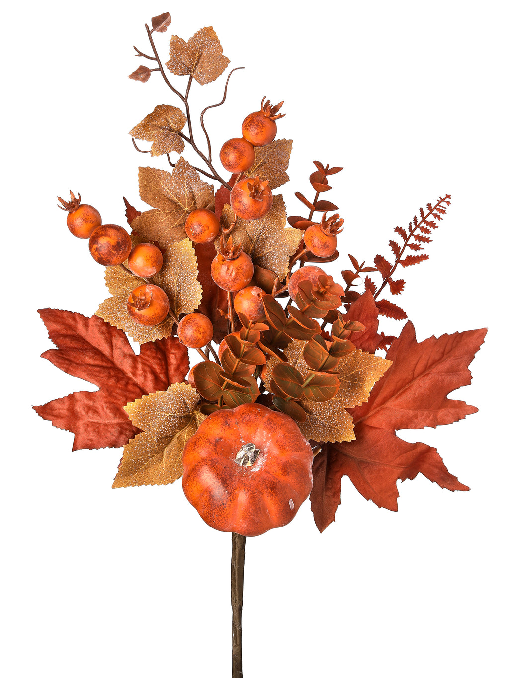 Richly layered and full of seasonal texture, the 16" Autumn Berry Pumpkin Pick is a vibrant celebration of fall’s natural beauty. This handcrafted stem features a mix of burnt orange berries, a petite pumpkin, glittering golden leaves, and deep rust-toned foliage, all arranged in a lush, dimensional spray.