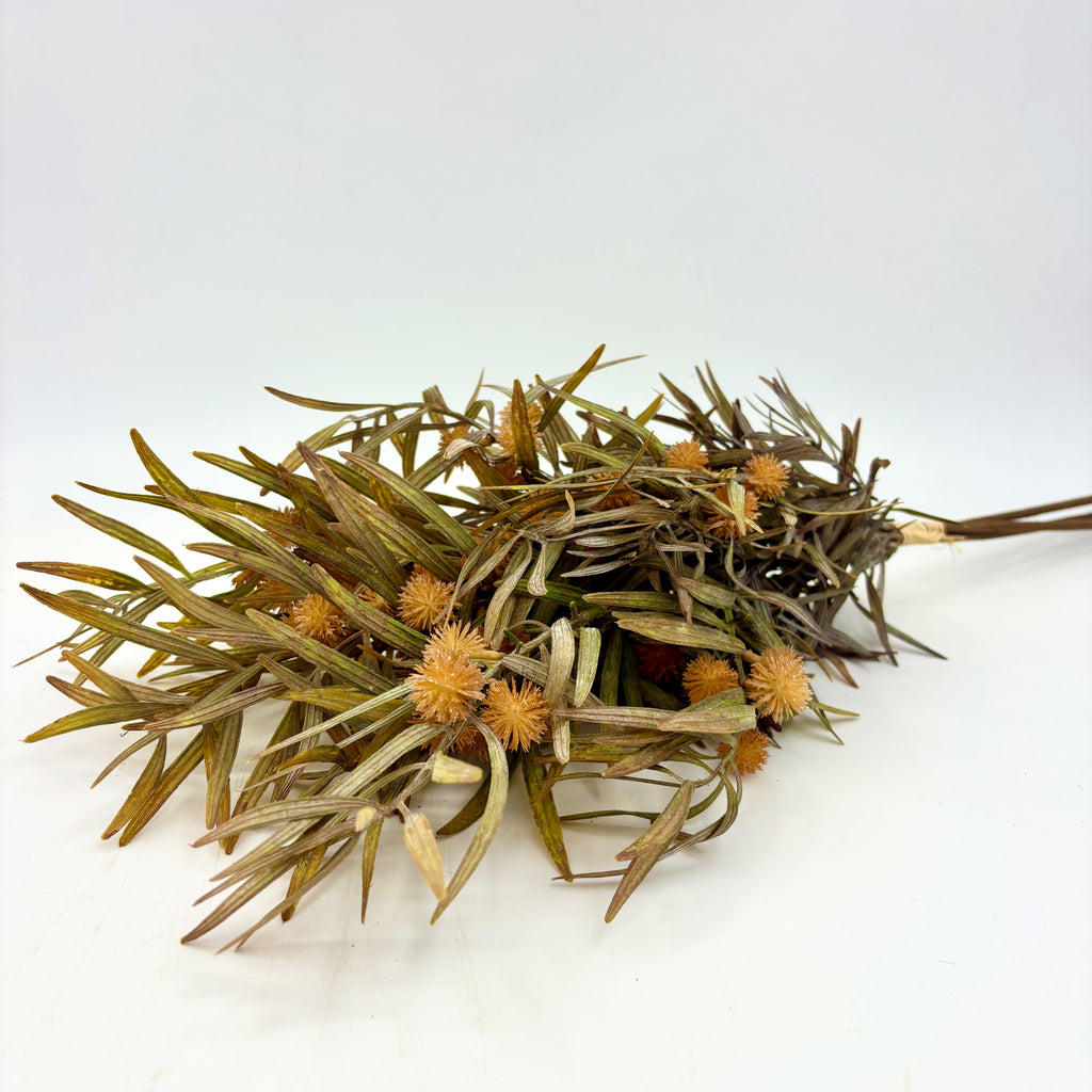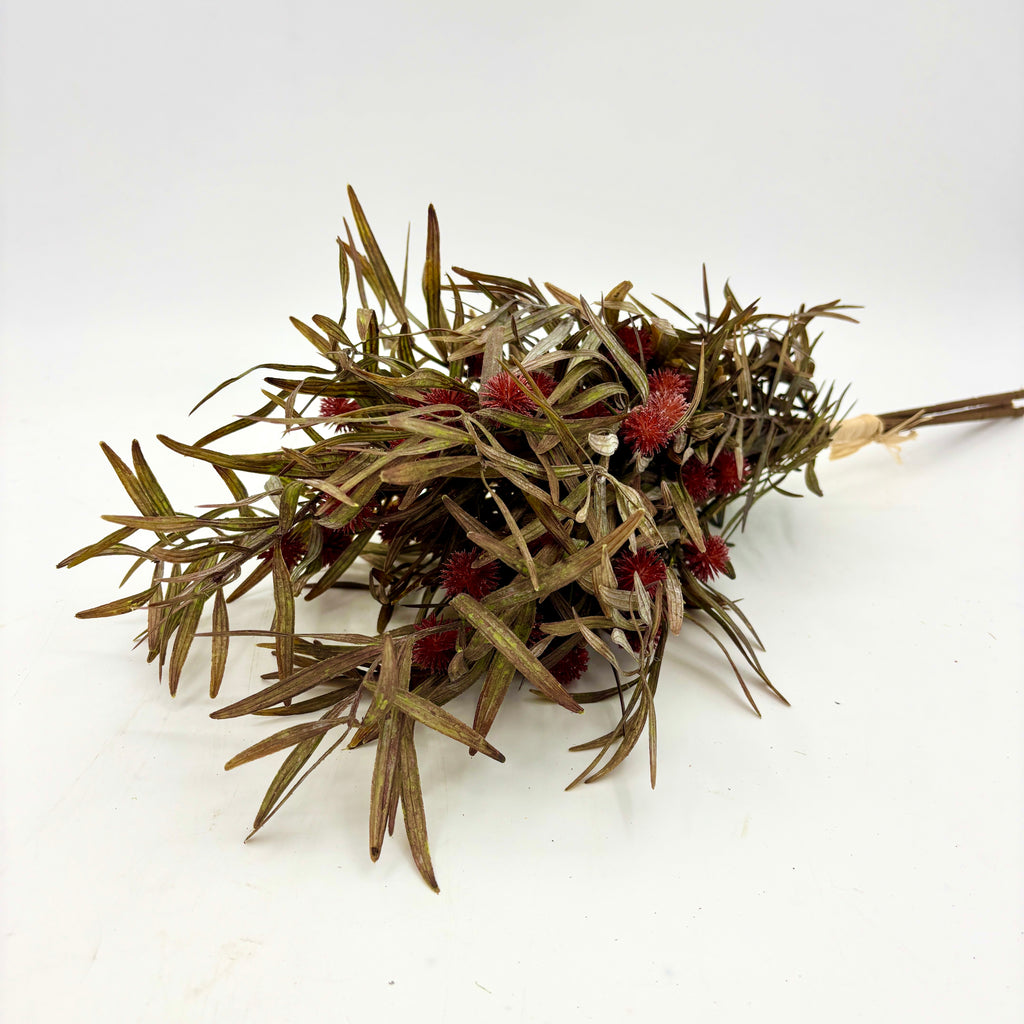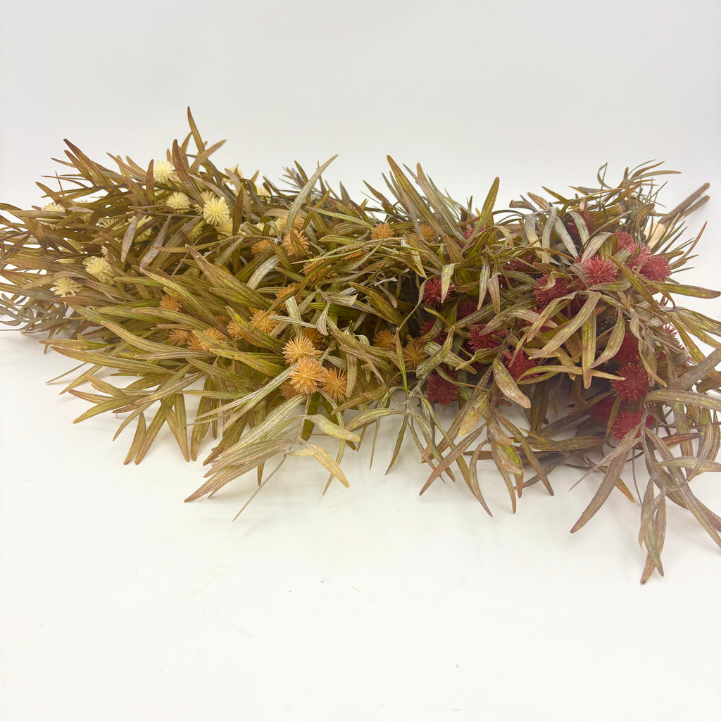 This tall mixed grass bush features slender, wispy foliage in soft, muted fall tones with delicate berry-like accents nestled throughout. The natural look and neutral palette create a versatile, organic feel perfect for seasonal arrangements, centerpieces, or vase styling. Each variation showcases a different accent color—burgundy berry, cream berry, or light brown berry—sold separately.