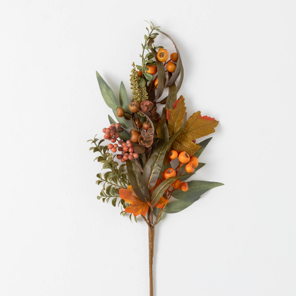 This multicolor fall spray features a rich blend of autumnal elements, including faux berries, foliage, and textured botanicals in warm seasonal tones. Designed for effortless styling in vases, wreaths, or arrangements.