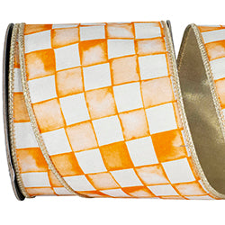 4"x10YDS Vintage Check Gold Back Dupioni Deluxe | Wired Edge Ribbon | Orange & White