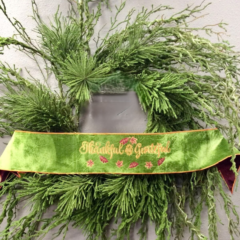 Wrap your space in seasonal sentiment with this 6" x 56" velvet banner, beautifully embroidered with "Thankful and Grateful" in warm autumn tones. The lush olive green velvet and rich burgundy backing are accented with delicate fall leaves, creating an elegant, layered look for wreaths, mantels, or tabletop displays. A graceful reminder of gratitude, perfect for Thanksgiving and harvest gatherings. *Wreath not inluded