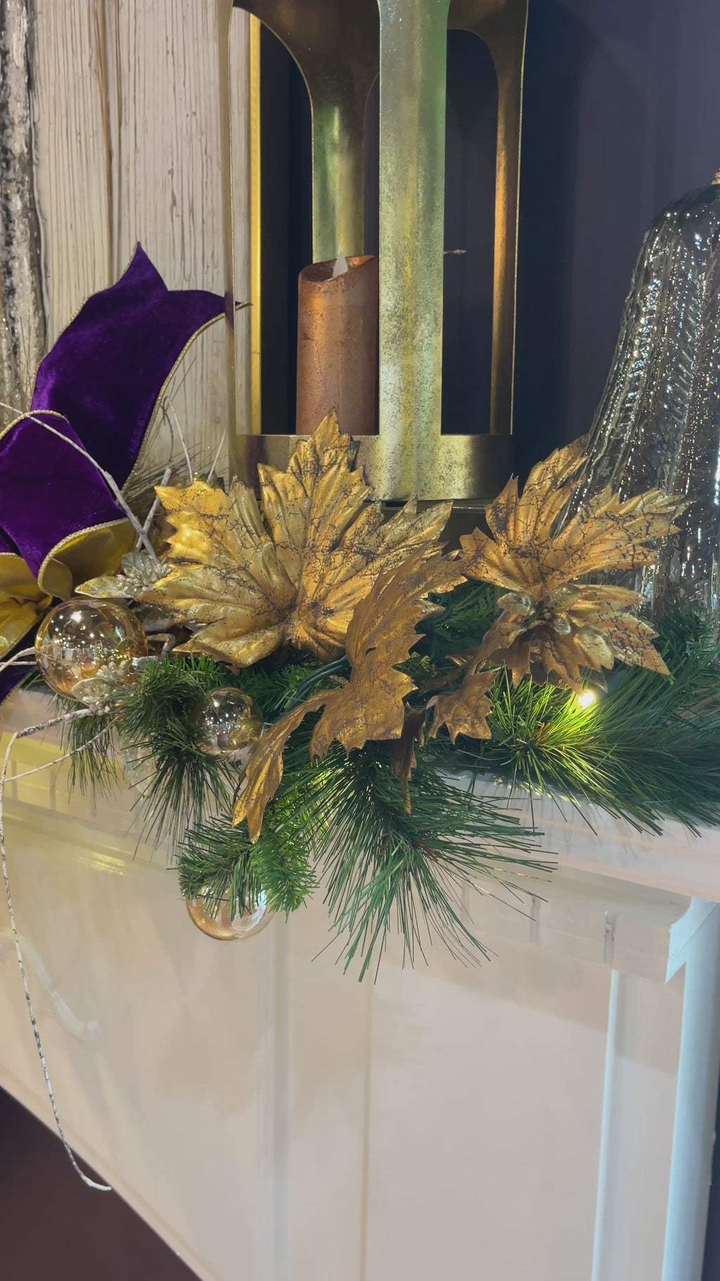 Drape your space in drama with the Gilded Splendor Garland—a 90-inch statement piece designed to captivate. This lush garland features cascading gold foliage with a gilded sheen, accented by hand-tied bows of deep plum ribbon and glimmering glass bubbles that catch the light like vintage ornaments.