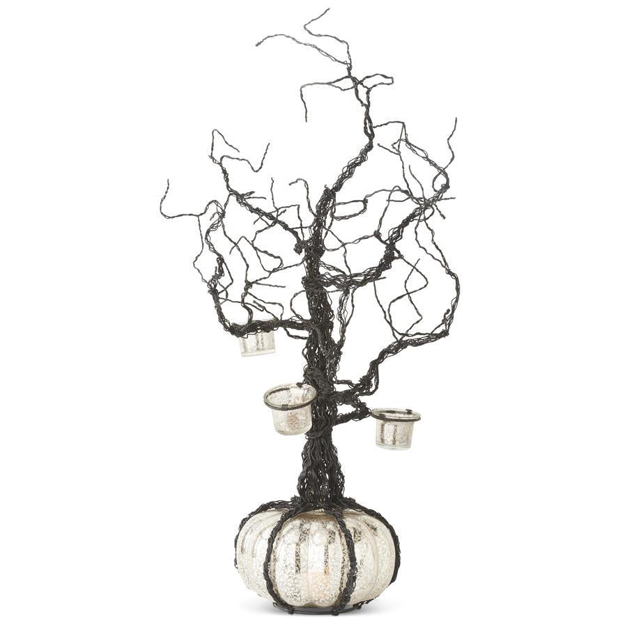 Cast an eerie glow over your Halloween display with this 28" Black Wire Votive Tree. Twisted black iron branches rise from a glittering mercury glass pumpkin base, complete with LED lighting for a haunting shimmer. Four votive holders hang from the branches, ready to hold your favorite flameless candles or lights for an enchanting effect.