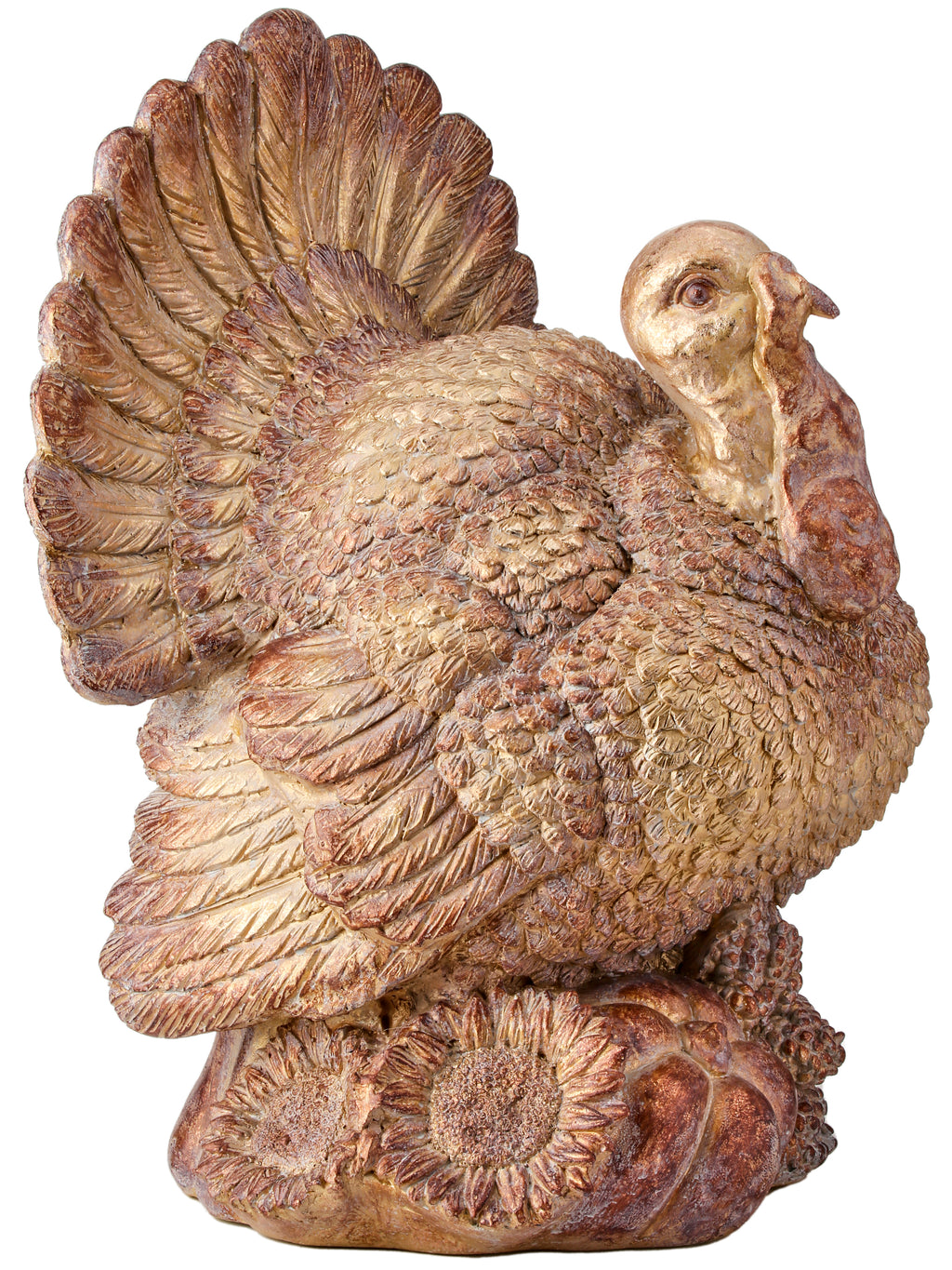 Command attention this Thanksgiving with the 23" Resin Grand Harvest Turkey—a showstopping centerpiece that embodies tradition with elevated artistry. Standing tall and proud, this magnificent turkey is sculpted with lifelike detail, from delicately layered feathers to the graceful curve of its stance. Richly hand-painted in a palette of antique gold, burnished bronze, and harvest copper, it radiates warmth and luxury. Resting atop a seasonal base of sunflowers, pumpkins, and autumn foliage, this statement piece transforms any entryway, hearth, or dining room into a celebration of abundance. A true collector’s piece, crafted for the hostess who decorates with distinction.