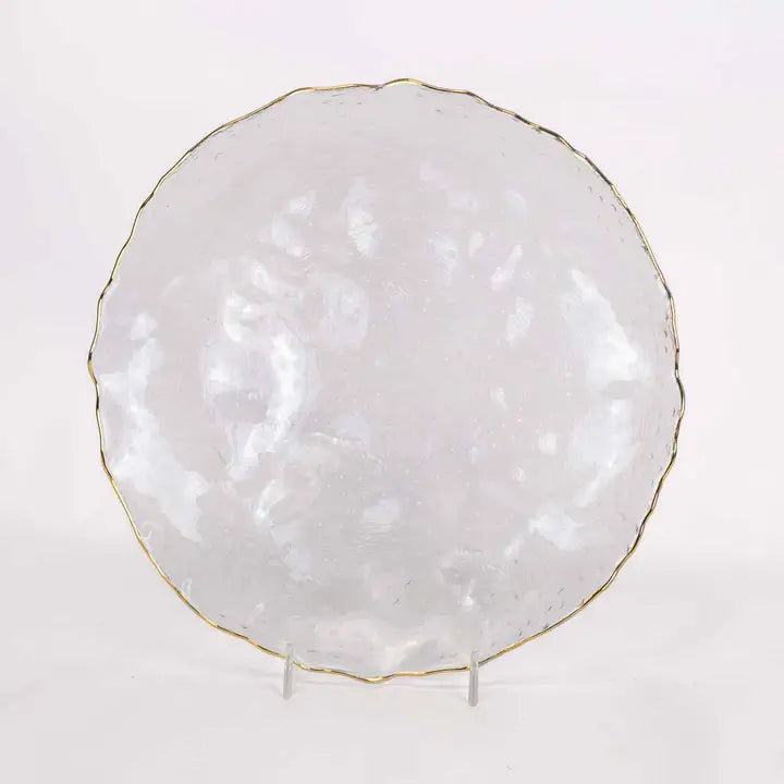 Elevate your table with timeless elegance using our Gold-Rimmed Glass Dinner Plate. Measuring 10.25 inches, this beautifully textured plate features a subtly scalloped edge and delicate gold trim—perfect for layering into both everyday and holiday place settings.