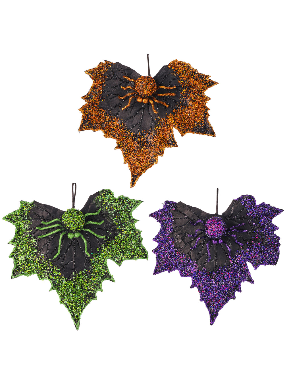10" Sequin Spider with Leaf | Purple/Black, Orange/Black, Green/Black
