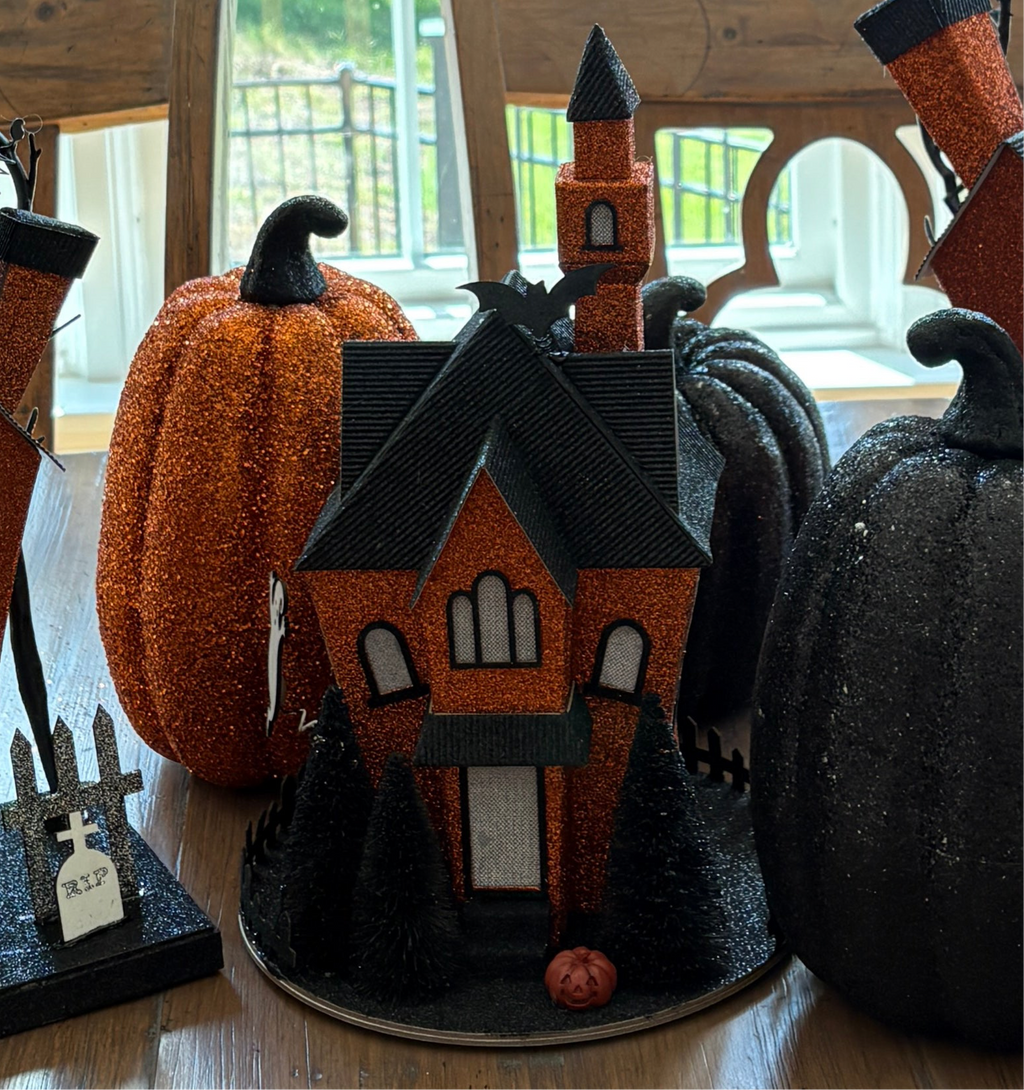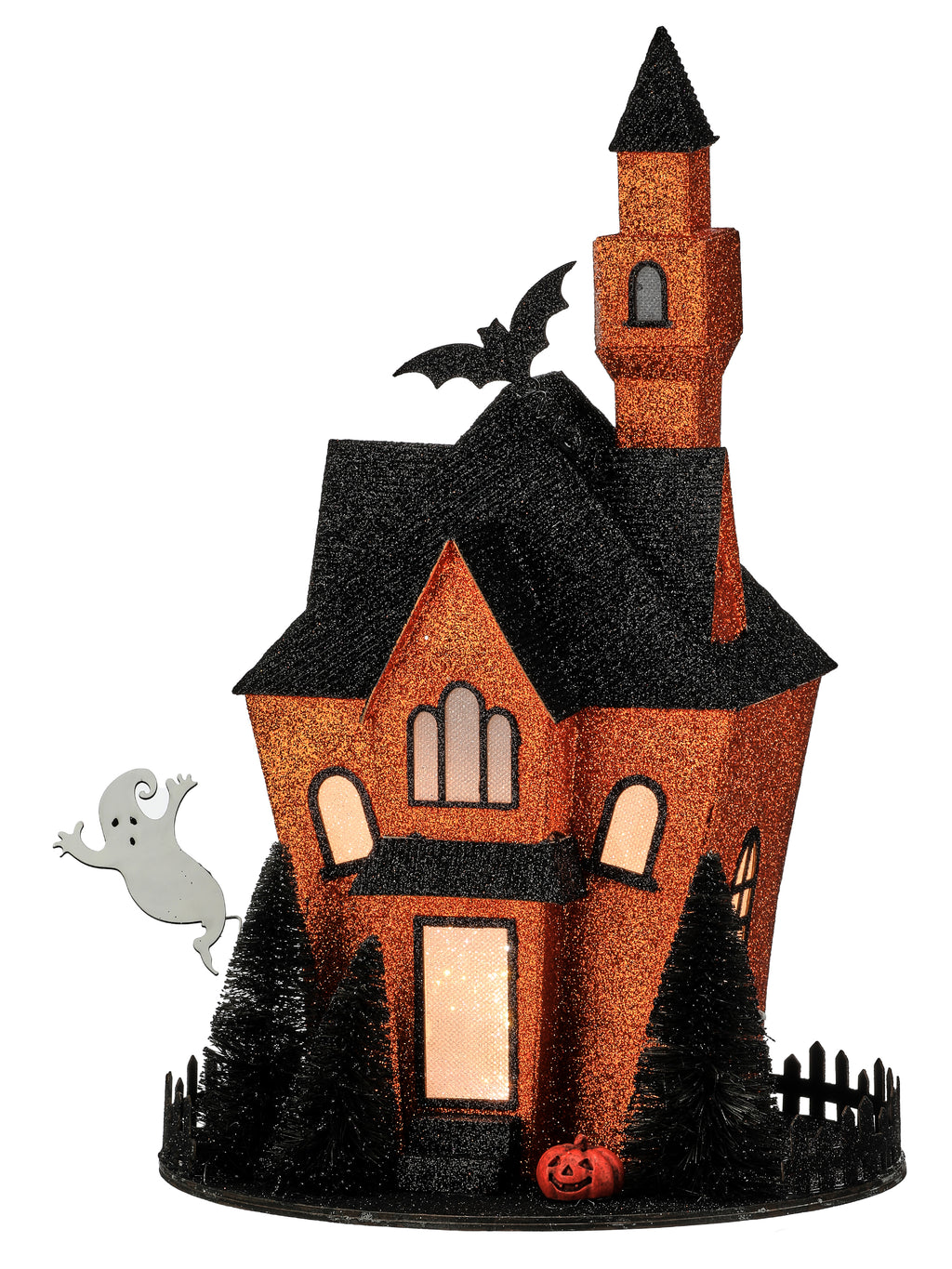 Add a touch of whimsy to your Halloween décor with the 13.5" LED Cardboard Haunted House. This charmingly spooky piece is finished in glittery orange and black, complete with haunted details like a bat, ghost, jack-o'-lantern, and bottle-brush trees. The soft glow from the battery-operated LED lights with timer brings it eerily to life.