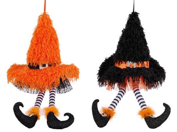 Add a touch of whimsical mischief to your Halloween décor with our 23"H Furry Witch Hat with Legs. Featuring a fluffy, textured witch hat in your choice of bold orange or classic black, each piece is finished with dangling striped legs and glittery curled shoes for a playful, theatrical effect. The soft, feathery finish brings a cozy-yet-spooky charm that's perfect for entryways, mantels, or hanging displays. Available in Orange or Black – Sold Separately