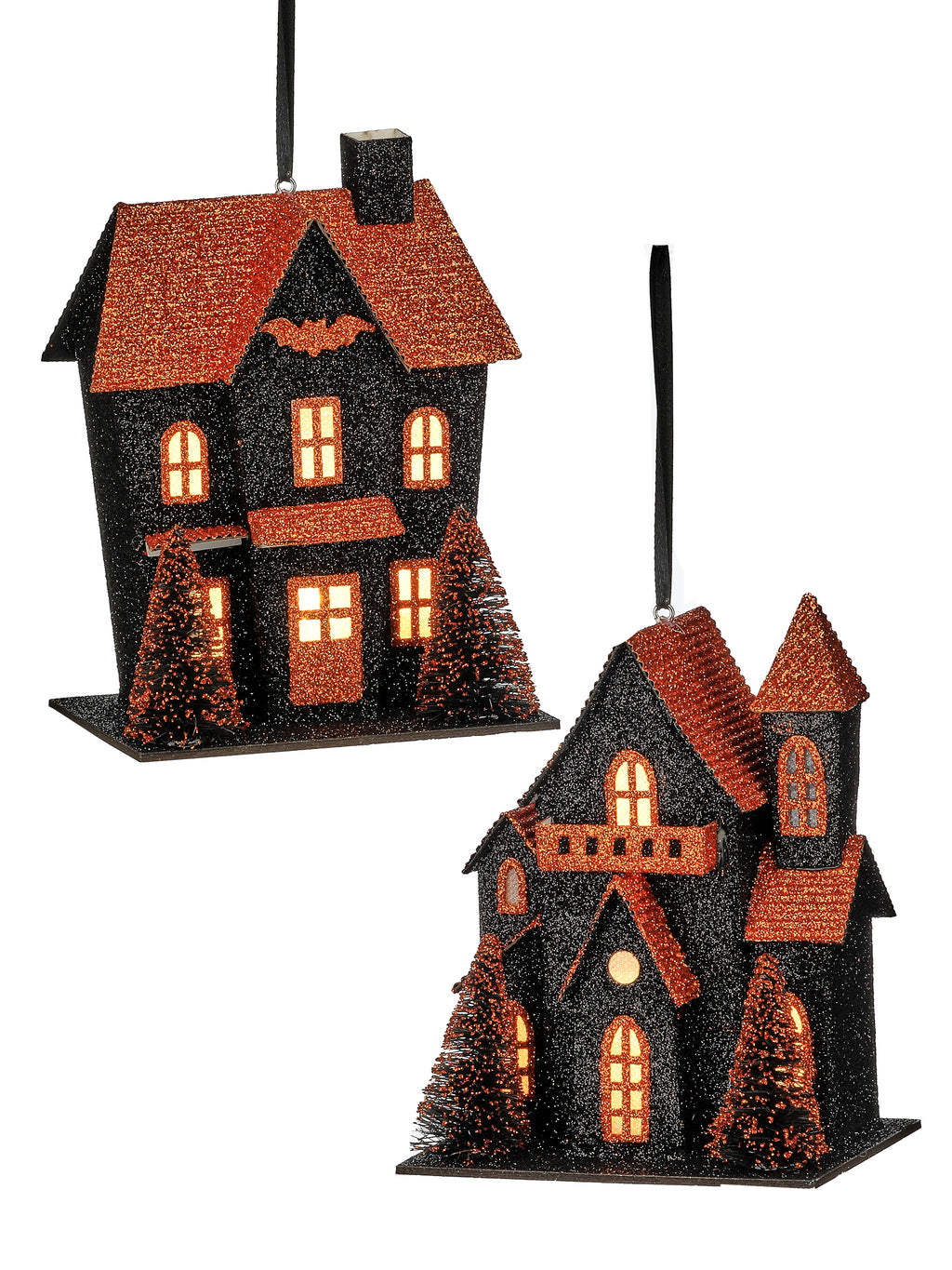 Bring a cozy glow to your haunted holiday décor with the 5" LED Halloween House Ornament, available in two charming styles—each sold separately. Designed in classic orange and black glitter, these miniature houses feature softly lit windows, bottle-brush trees, and spooky silhouettes, all powered by battery with a convenient timer function.