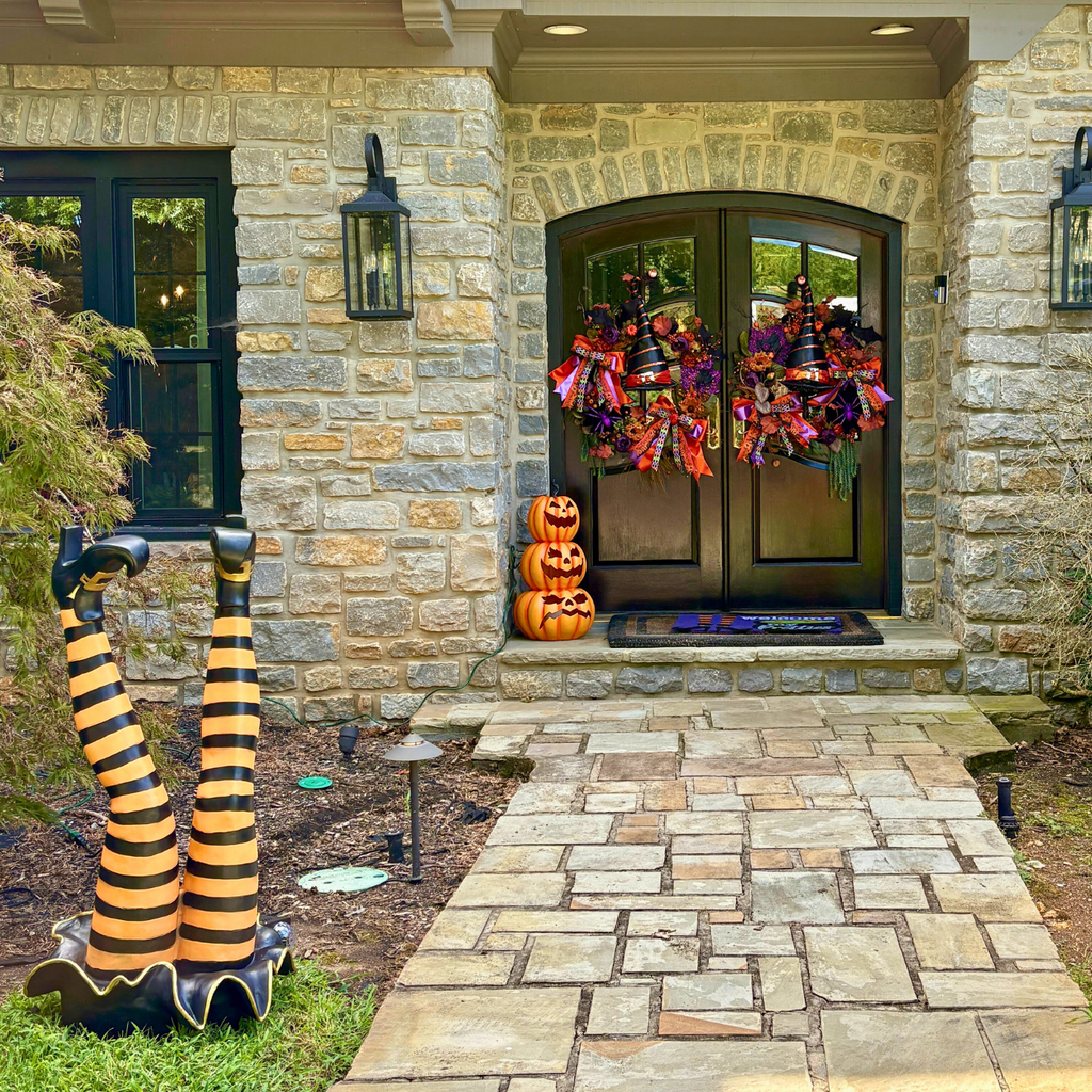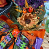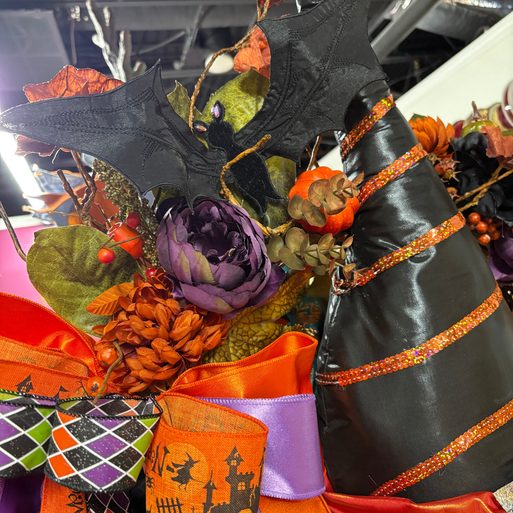 Bats, Bows & Bewitchment Designer Halloween Wreath Cast a spell on your entryway with our Bats, Bows & Bewitchment wreath—a showstopping piece that embodies the spirit of Halloween elegance. This handcrafted designer wreath is bursting with lush florals in haunting shades of deep purple, fiery orange, and midnight black. Striking Halloween bows in harlequin patterns, satin ribbons, and glittering accents bring a playful yet polished touch, while whimsical bats and a statement witch’s hat complete the enchanting design. Perfect for Halloween door décor, this wreath adds instant magic to porches, parties, and seasonal displays.