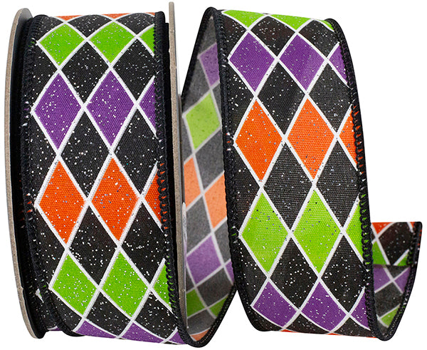 Add playful sparkle to your Halloween decor with this 1.5-inch wide, 10-yard long Halloween Diamond Glitter Wired Ribbon. Featuring a bold diamond pattern in lime green, purple, orange, and black, accented with fine glitter and crisp white outlines, this ribbon brings energy and charm to any display. Wired edges provide structure for precise bows, creative trims, and festive accents that stay perfectly in place.