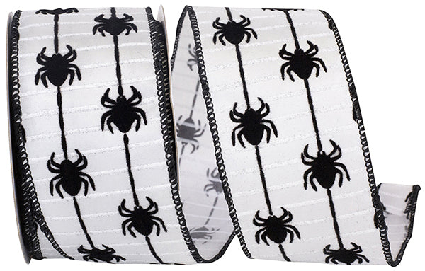 Add a sophisticated touch of Halloween whimsy with this spider-themed ribbon. Featuring a soft white background accented by vertical stripes and velvet-black flocked spiders, this ribbon delivers both texture and drama. The wired edges allow for easy shaping, making it ideal for bows, wreaths, and seasonal displays. Elegant, eerie, and perfectly polished for upscale autumn décor.