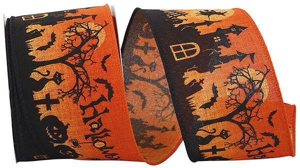 Add eerie charm to your Halloween decor with this 2.5" wide, 10-yard ribbon featuring a haunting black street scene on a vibrant orange background. Spooky silhouettes of bats, witches, haunted houses, jack-o'-lanterns, and graveyard trees create a chillingly festive design perfect for wreaths, garlands, bows, and seasonal crafts. The wired edge ensures crisp shaping for all your decorating needs.