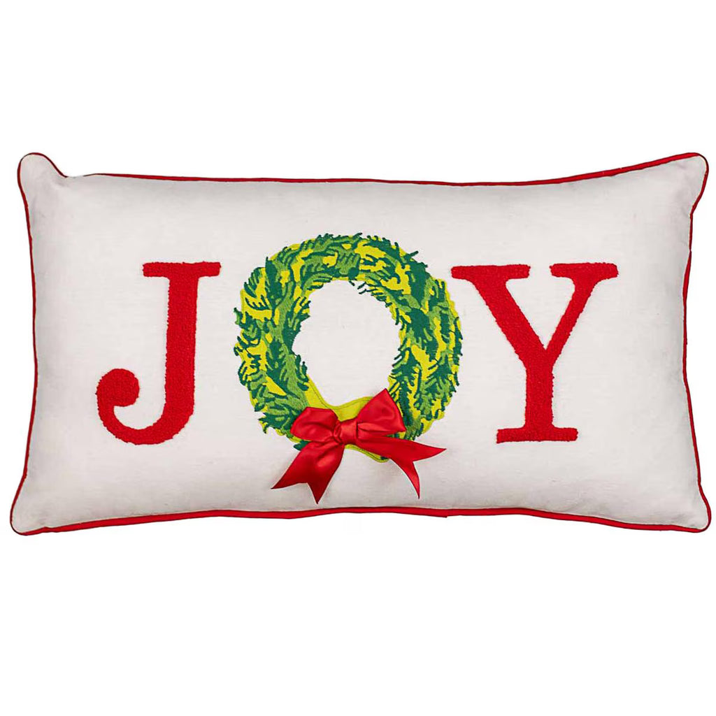 Celebrate the season in bold, beautiful style with the Grand JOY Wreath Pillow. Measuring 24"x13", this striking lumbar pillow features the word JOY embroidered in rich, dimensional lettering, with the “O” elegantly replaced by a festive holiday wreath. Set against a classic neutral or seasonal backdrop, it offers a sophisticated nod to holiday cheer—perfect for entry benches, sofas, or guest room beds.