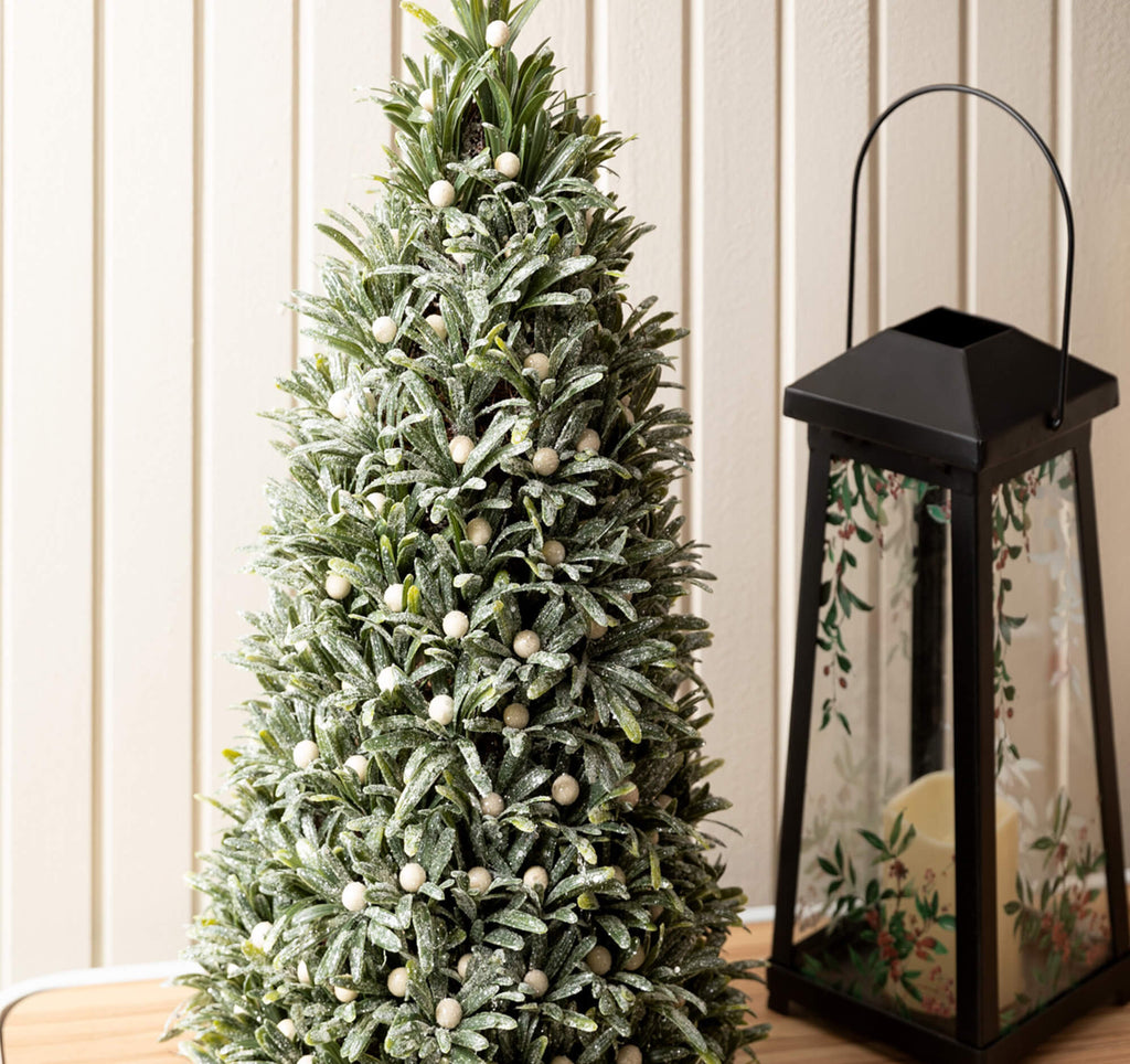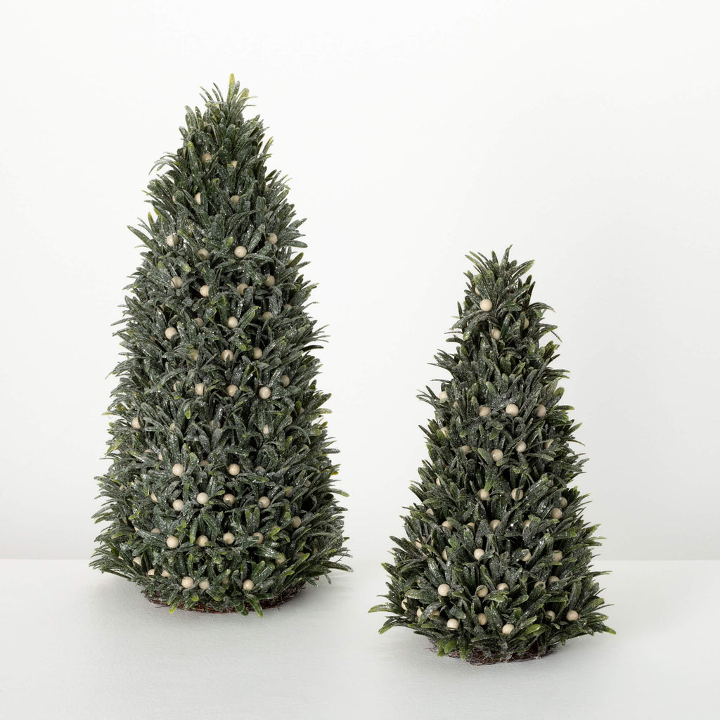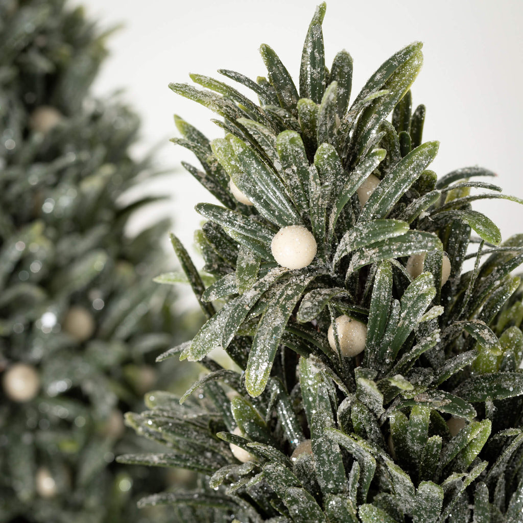 Bring natural charm to your holiday decor with this Mistletoe Tree Set of 2. Each tree features layered mistletoe-style leaves dusted with glittery frost and dotted with pearl-like berries for a wintry, woodland look. Perfect for tabletops, mantels, or entryway displays.