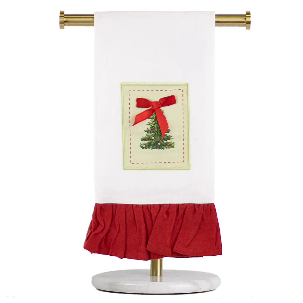 The 20"x28" Noelle Tree Ruffled Hand Towel infuses your space with classic holiday elegance through subtle detail and refined charm. The central Christmas tree, delicately stitched and topped with a dimensional red bow, evokes a hand-crafted warmth that feels both nostalgic and elevated. A bold red ruffled hem adds softness and texture, transforming this towel from functional to decorative.