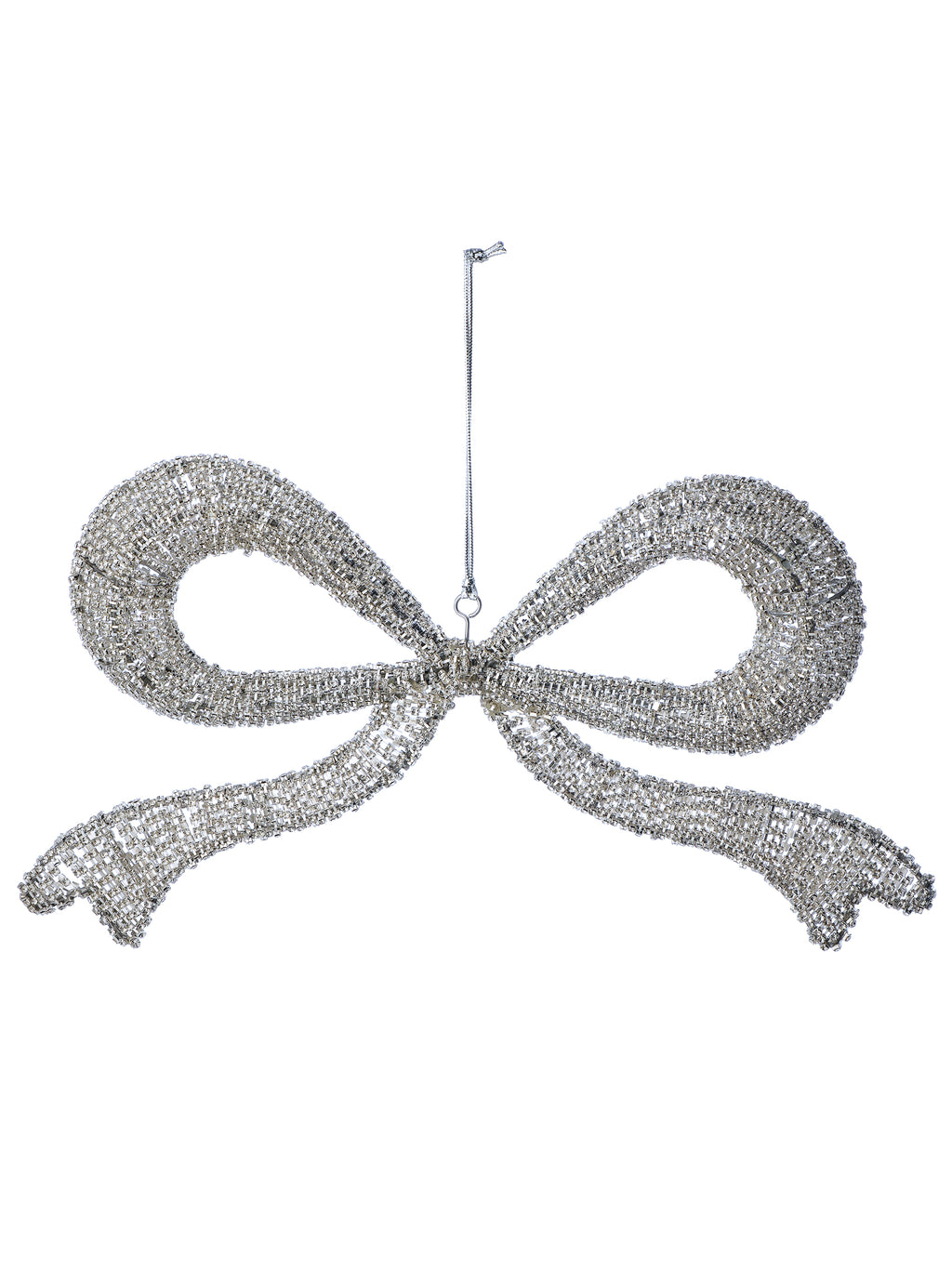 Bring sparkle and elegance to your holiday décor with this 16-inch platinum gift bow ornament. Crafted from shimmering jeweled wire, this bow features a delicate openwork design that catches the light beautifully. Perfect for adorning trees, garlands, or wreaths, it adds a sophisticated finishing touch to glam and modern holiday themes.