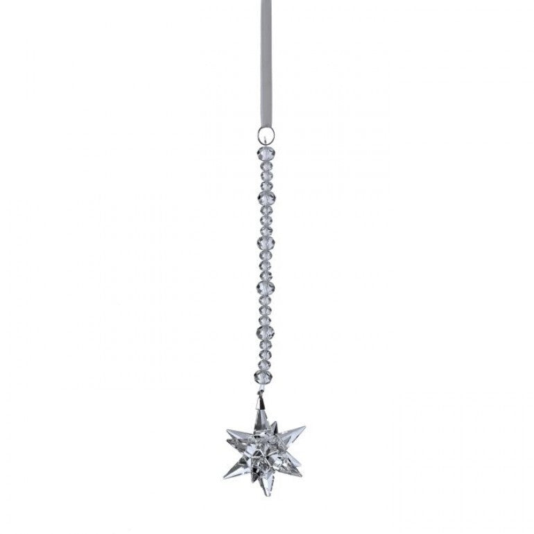 9" Crystal Starburst Drop Ornament Bring icy brilliance and refined sparkle to your holiday décor with this stunning 9" Crystal Starburst Drop Ornament. Suspended from a strand of faceted crystal beads, the multi-pointed starburst dazzles with clarity and dimension, capturing and reflecting light beautifully from every angle. Finished with a sleek silver ribbon for easy hanging, it adds a luxurious, wintry elegance to trees, garlands, chandeliers, or window displays.