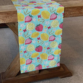 Brighten up your table with the 13"x72" Strawberries & Lemon Table Runner! Made from 100% cotton, this cheerful design features a vibrant mix of strawberries, lemons, and citrus blooms on a fresh aqua background. Perfect for summer gatherings, brunches, or everyday dining, this runner adds a playful yet elegant touch to any tablescape. Lightweight, breathable, and machine washable, it’s as practical as it is stylish.