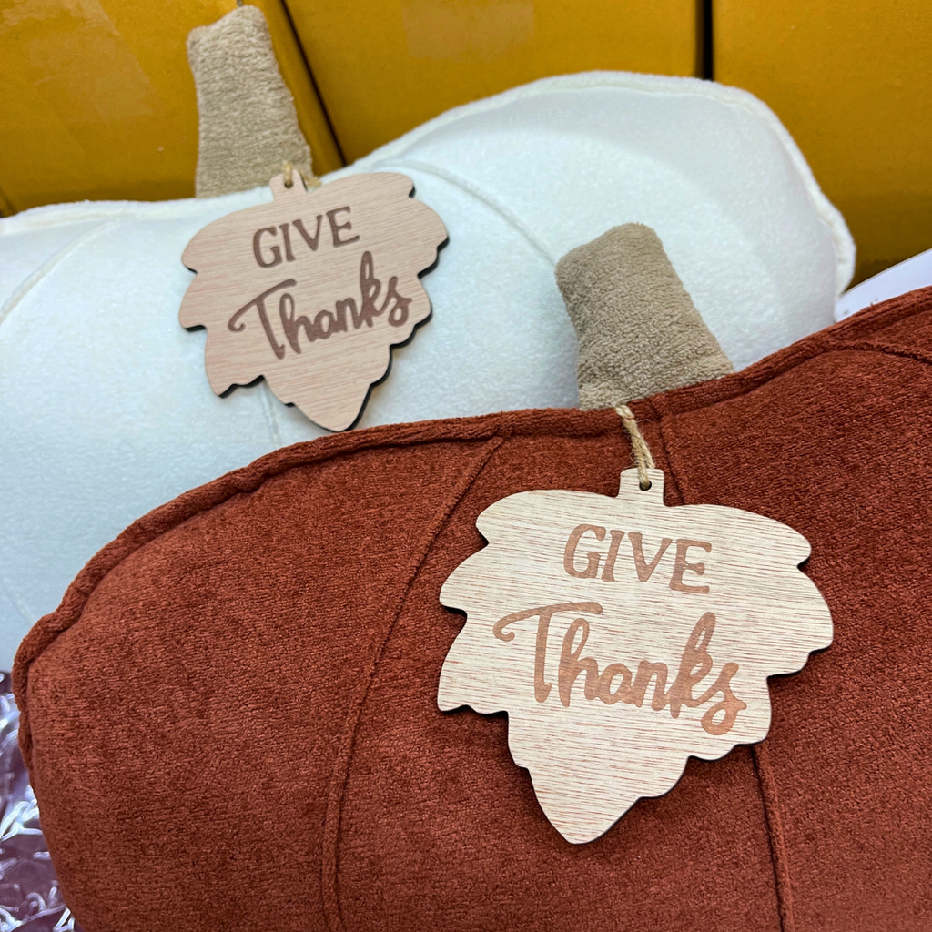 These Pumpkin with Leaf Pillows are a soft, cozy nod to harvest season with just the right touch of gratitude. Available in two classic hues—Burnt Orange or Cream—each pillow is finished with an adorable wooden “Give Thanks” leaf tag that adds a handcrafted, thoughtful detail.