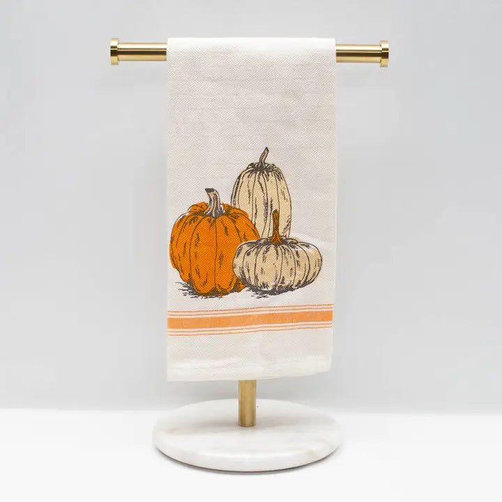 Celebrate the season with this richly textured fall hand towel, featuring a trio of classic pumpkins in warm, rustic hues. The orange stripe adds a vintage farmhouse touch—perfect for cozy fall kitchen decor or Thanksgiving hostess gifts. Measuring 20 inches by 28 inches, it offers both decorative charm and everyday functionality throughout the fall season.