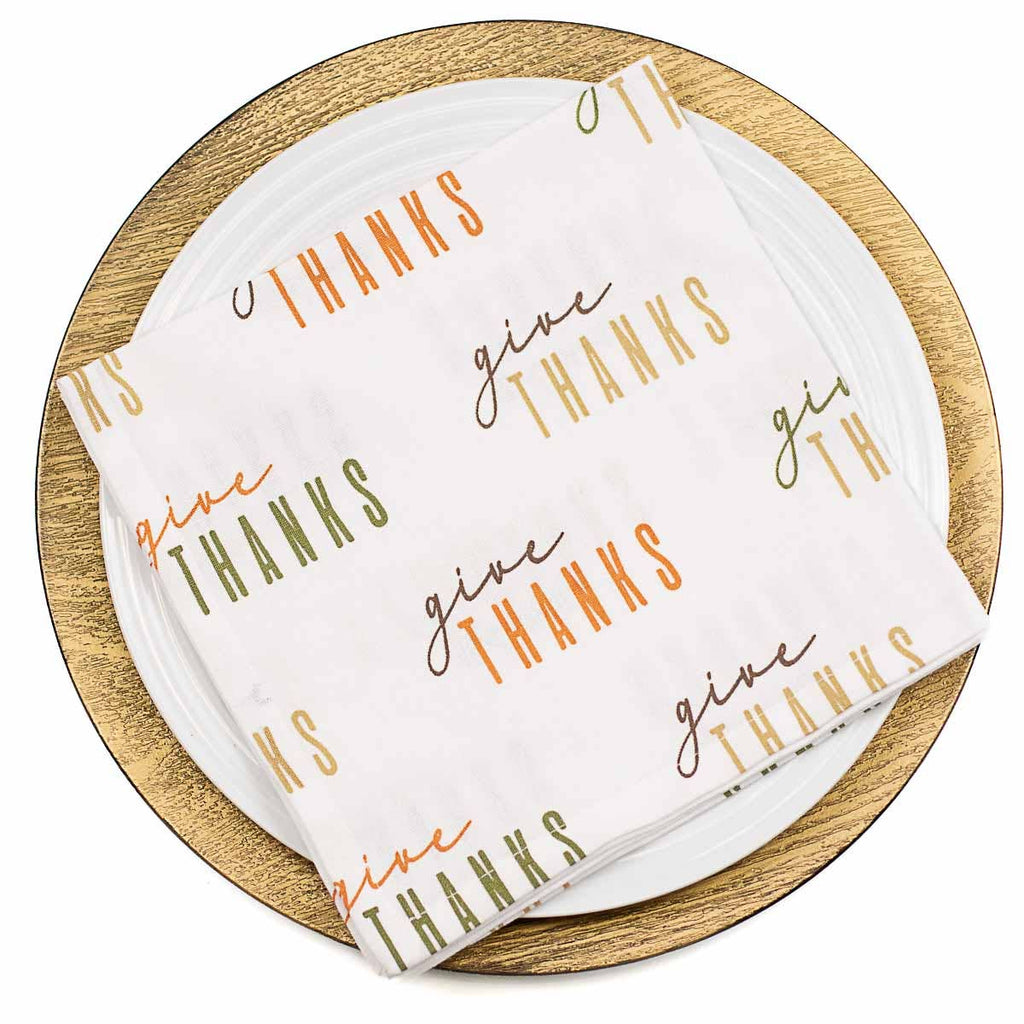 Set a festive and heartfelt tone at your fall gatherings with the 18"x18" Give Thanks Napkin. Featuring a repeating give thanks script and block lettering in rich autumn tones of green, orange, and brown on a crisp white background, this napkin adds warmth and gratitude to your holiday table. Perfect for Thanksgiving and seasonal entertaining, it layers beautifully with a variety of place settings and décor styles.