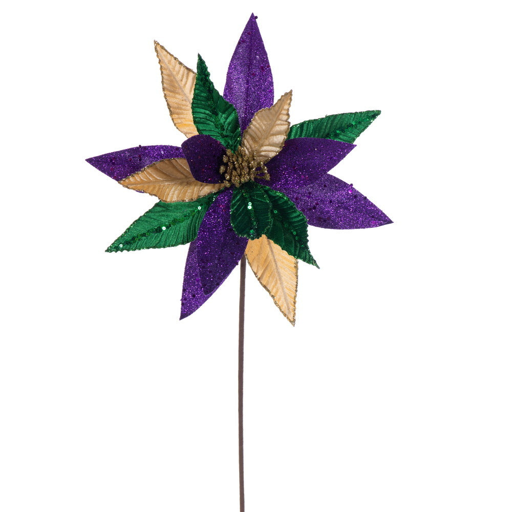 Celebrate the season with vibrant sparkle! This 20" Mardi Gras Flower Spray features a striking 12" wide bloom in bold shades of purple, green, and gold – the traditional Mardi Gras color trio. Accented with glittered petals, metallic fabric, and shimmering sequins, it adds festive flair to centerpieces, wreaths, or party decor.