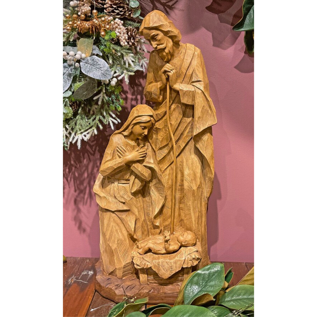 Description: Root your holiday decor in tradition and quiet reverence with this carved-look Holy Family Nativity. Crafted from durable resin with the appearance of hand-hewn wood, this piece adds warmth and spiritual depth to your seasonal vignettes. Beautiful on a mantel or nestled within real-touch greenery.