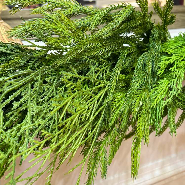 A fresh take on tradition—this mixed garland combines the soft texture of Norfolk Pine with the feathery detail of Cypress. Slightly shorter in length, it’s perfect for tabletops, buffets, or layering into arrangements where you want dimension and a touch of natural variation.