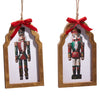 The 7.5" Nutcracker Framed Ornament features two distinct styles, each showcasing a classic nutcracker design printed on a canvas-like background and set within an arched, gold-painted frame. A red velvet bow and natural twine loop complete the ornament, offering a festive, vintage-inspired look. Each style is sold separately.