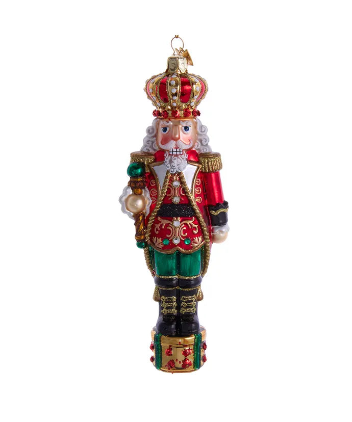 Crown your holiday tree with timeless elegance. The Bellissimo Glass King Nutcracker Ornament stands 7" tall and is masterfully crafted from hand-painted glass, adorned with glittering embellishments and jewel-toned accents. With his ornate crown, jeweled scepter, and richly detailed attire, this king nutcracker brings both tradition and grandeur to your holiday collection.