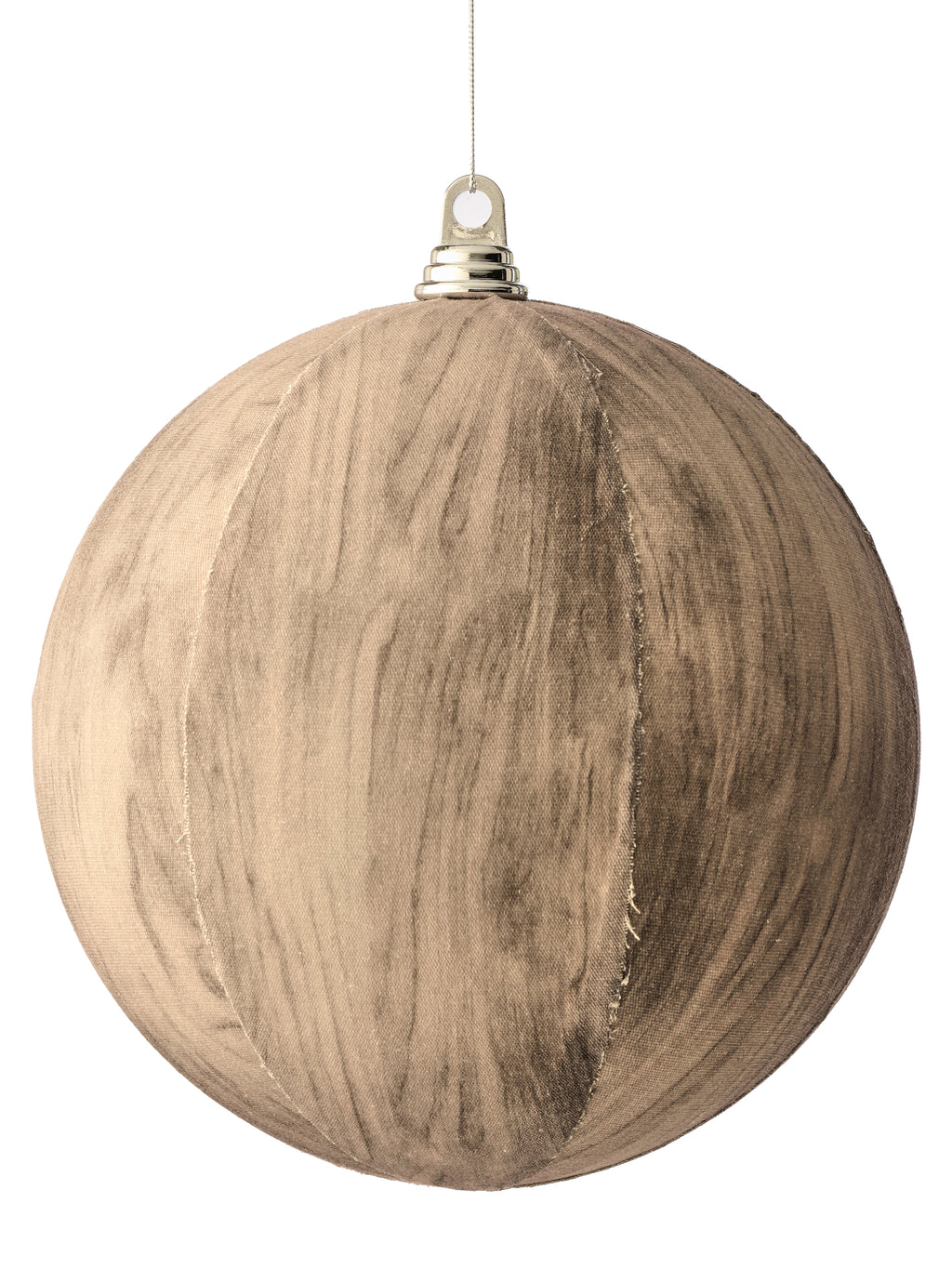 250mm (9.84") Natural/Brown Fabric Wood Tone Ball Ornament Bring earthy elegance and organic texture to your holiday décor with this oversized Natural/Brown Fabric Wood Tone Ball Ornament. Measuring nearly 10 inches in diameter, this statement piece features a fabric-wrapped surface printed with a realistic wood grain effect—offering the warmth of rustic styling with the softness of textile design. Its neutral tones pair effortlessly with both classic and contemporary themes.