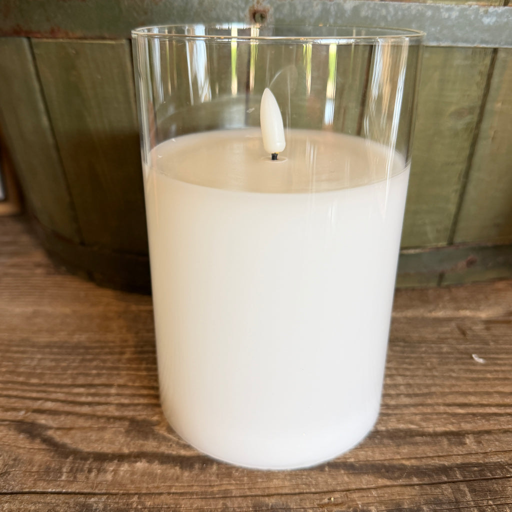 White LED candle set in clear glass vessel