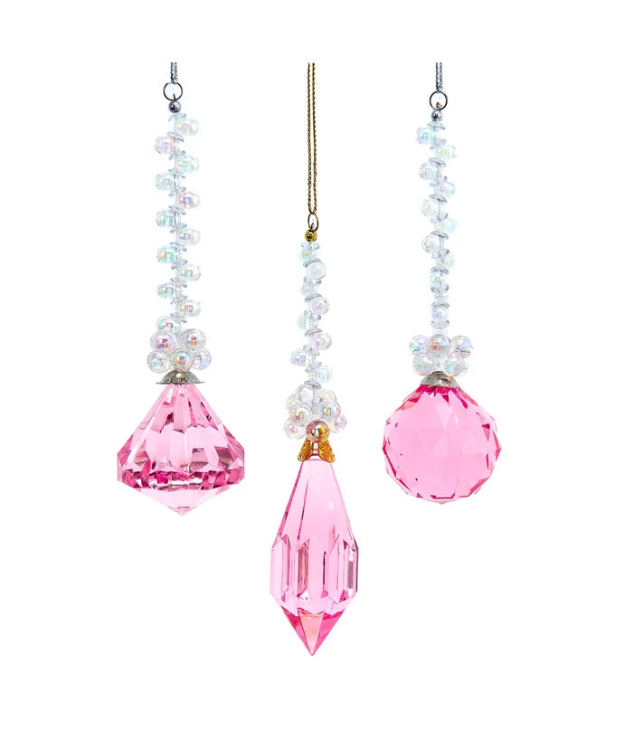 Add a touch of glamour to your holiday décor with the Pink Acrylic Drop Ornament. Each 5–5.5" ornament features a faceted pink acrylic drop that beautifully reflects light, suspended from a strand of iridescent beads for extra shimmer. Available in three stunning styles—each sold separately—these ornaments bring playful elegance and modern sparkle to your Christmas tree, garlands, or chandelier-inspired displays.