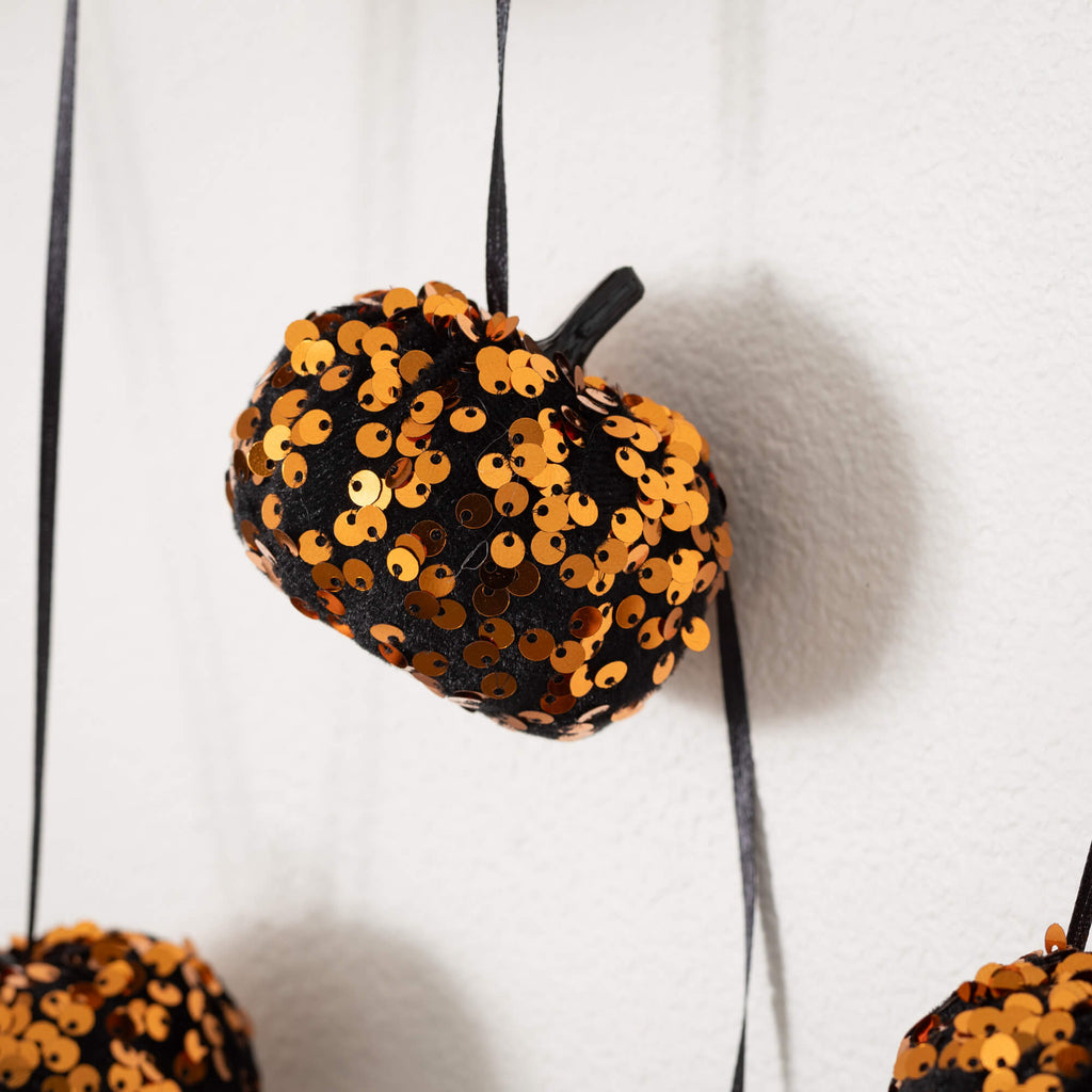 Bring glitzy charm to your Halloween or fall decor with this 6-foot Shimmer Gold Pumpkin Garland. Featuring mini pumpkins covered in dazzling orange sequins, each one pops against a black ribbon for bold seasonal contrast. Whether hung across a mantel, window, or party display, this eye-catching garland adds sparkle and festive flair to your spooky setup.