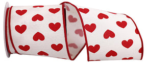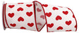 4" White | Red Hearts | Dupioni Wired Edge Ribbon | 5 Yards